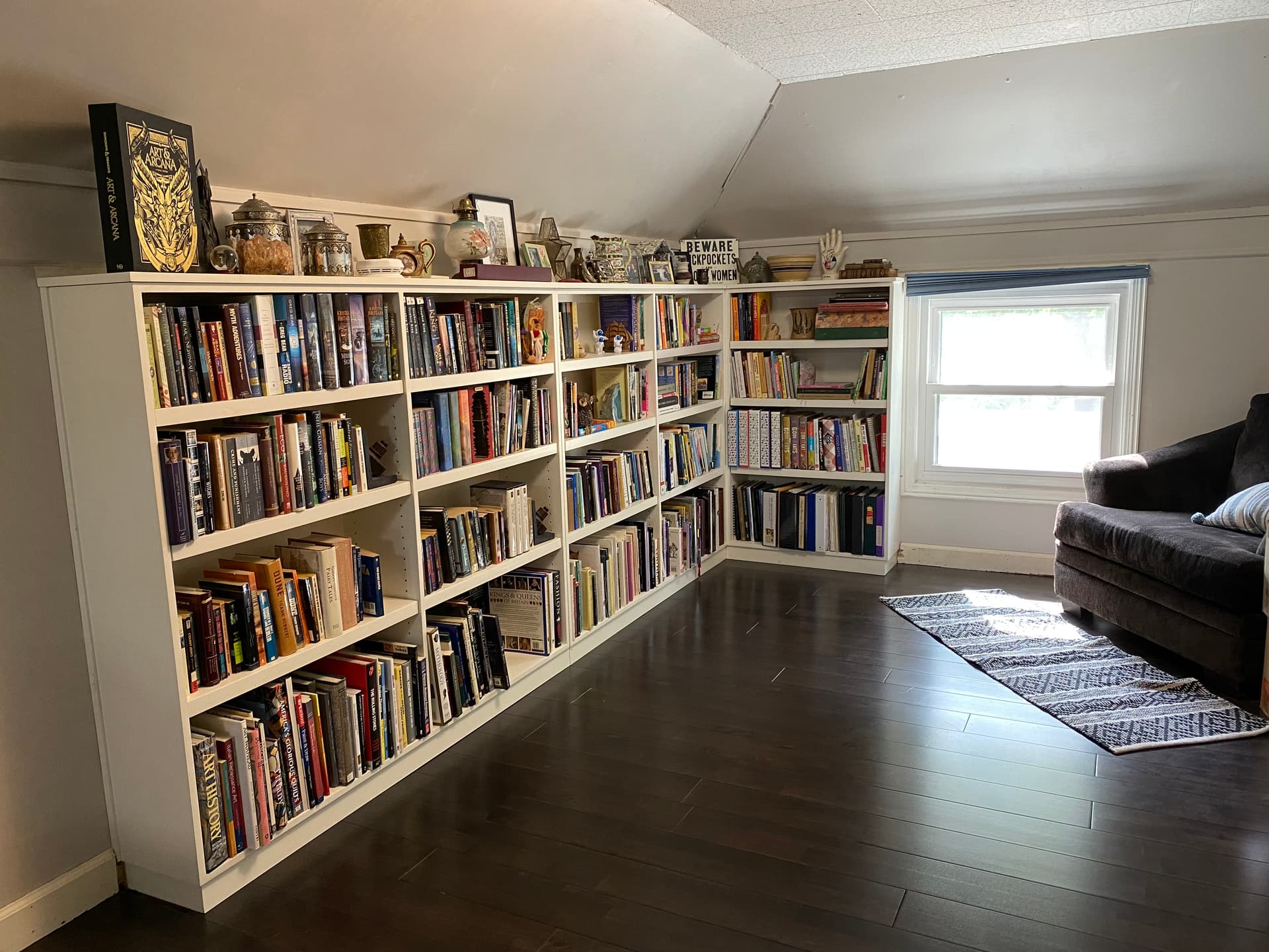 Our house has a bonus room above the garage. It’s a odd room, 40 feet long, and 12 feet wide, with eves. One end has larger bookcases, that we have filled with our grown up books. But the other end (which is the first thing you see as you come up the stairs) has smaller shelves that held games, most of Ada’s picture books, and a couch where we read her stories at night. It’s kind of a low-tech second living room, and Jim often likes to hang out up there with Ada in the afternoons.