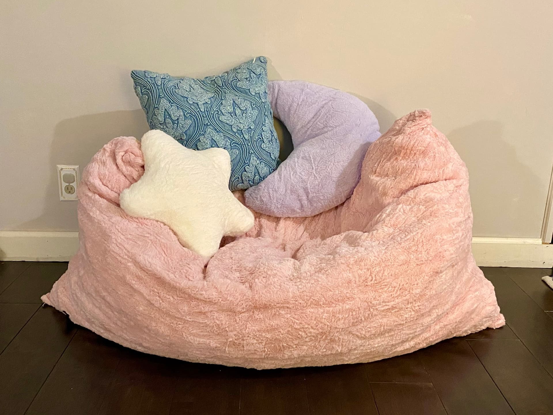 After a little searching, I found a giant fluffy pink one on Amazon. It can be used as a traditional bean bag chair, or laid flat as a bed, or folded against the wall as a chair. And when I saw them, I just had to add a matching Moon and Star pillow to my order too. I couldn’t help it. They’re soft and fuzzy, and my kiddo would lose her mind when she saw them. I dug through my stash of extra housewares stuff, and found the blue down pillow, my mom gave me.