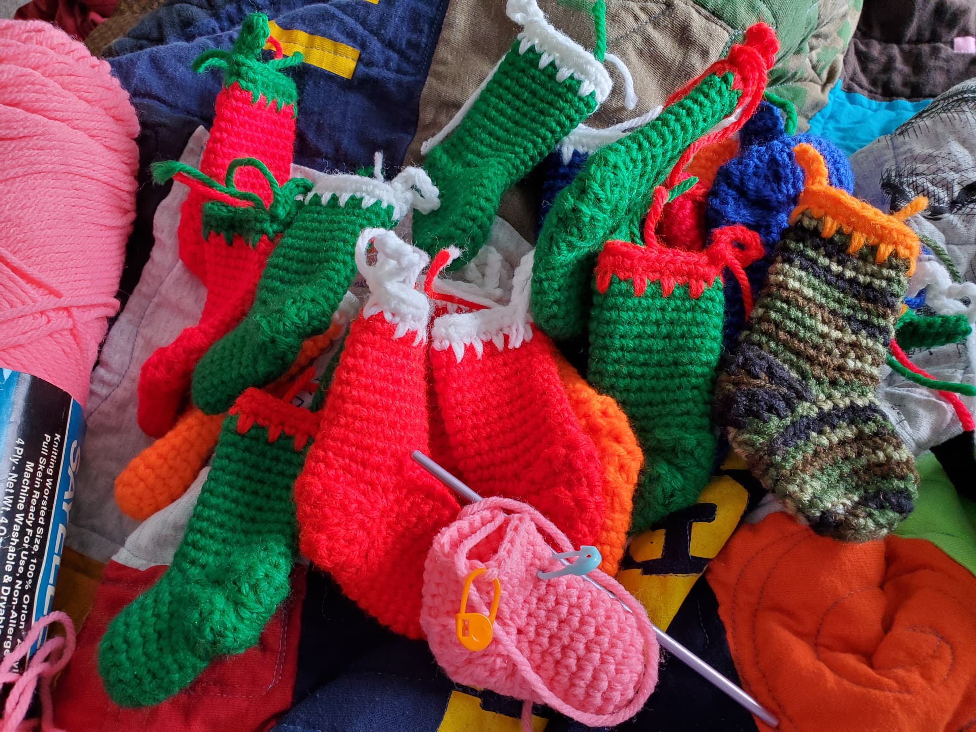 I tried a few different patterns, but they didnโt turn out how I wanted, so I made up my own! I used a variety of acrylic yarns to make them in a bunch of different colors. Most of my relatives took one, so I think they turned out well!
