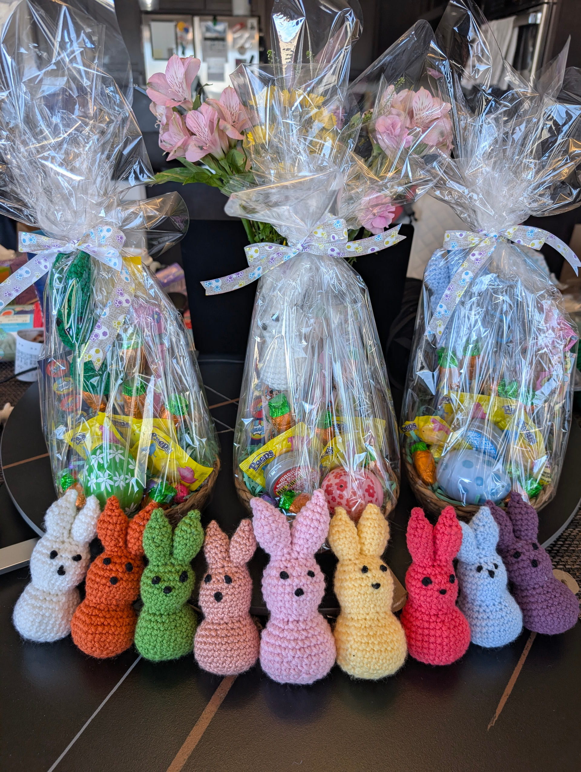 Made a few crocheted Bunny Peeps and Easter baskets. I used this pattern for the bunnies. They are about 6 inches tall and pretty quick and easy.