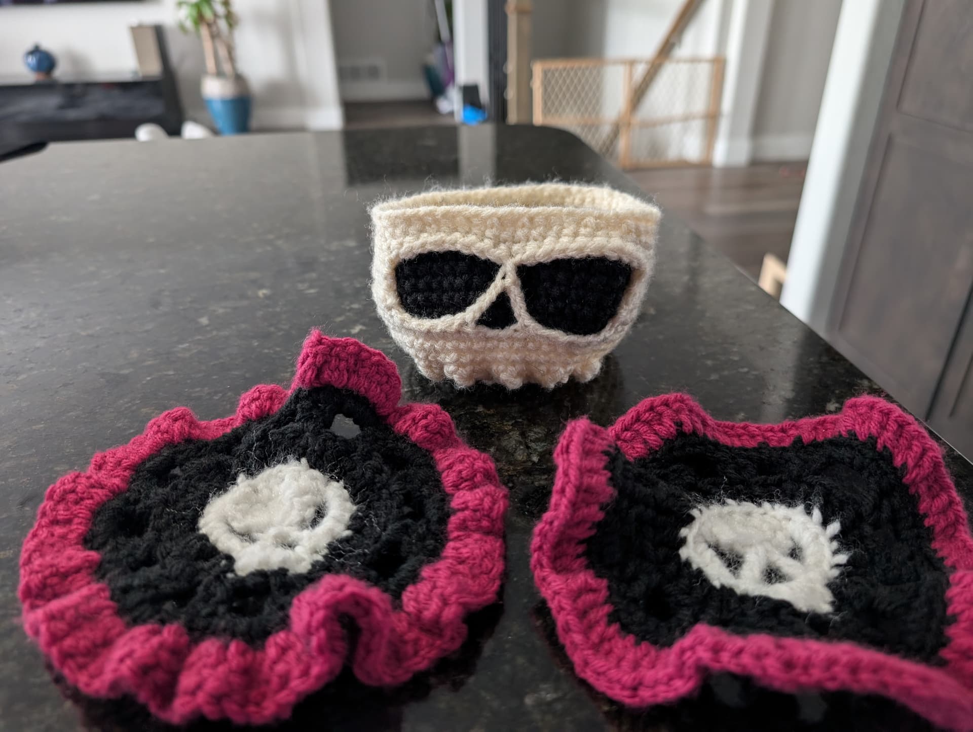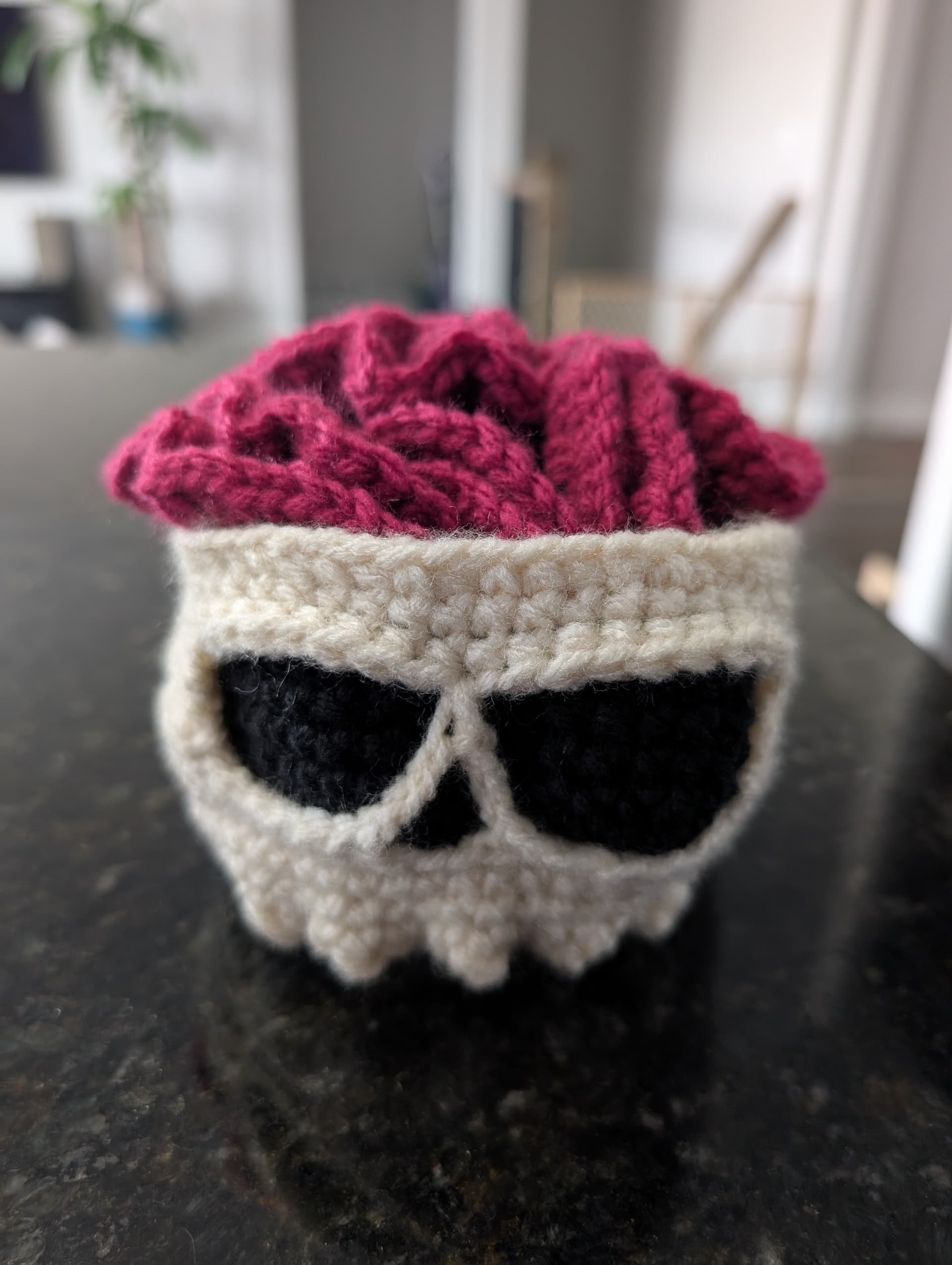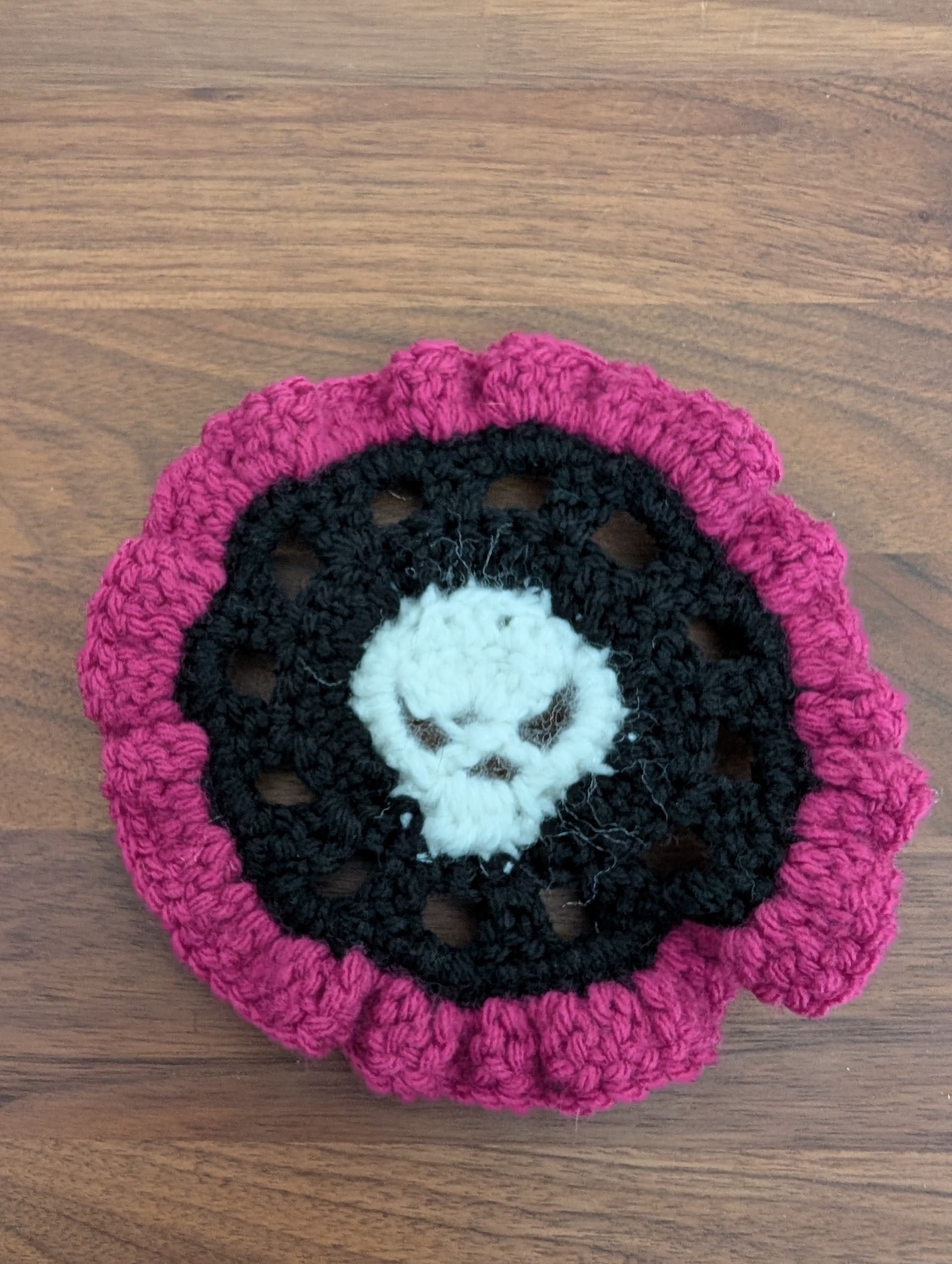 Pattern here: https://www.etsy.com/listing/1757805356/brainy-skull-coaster-set-crochet-pattern