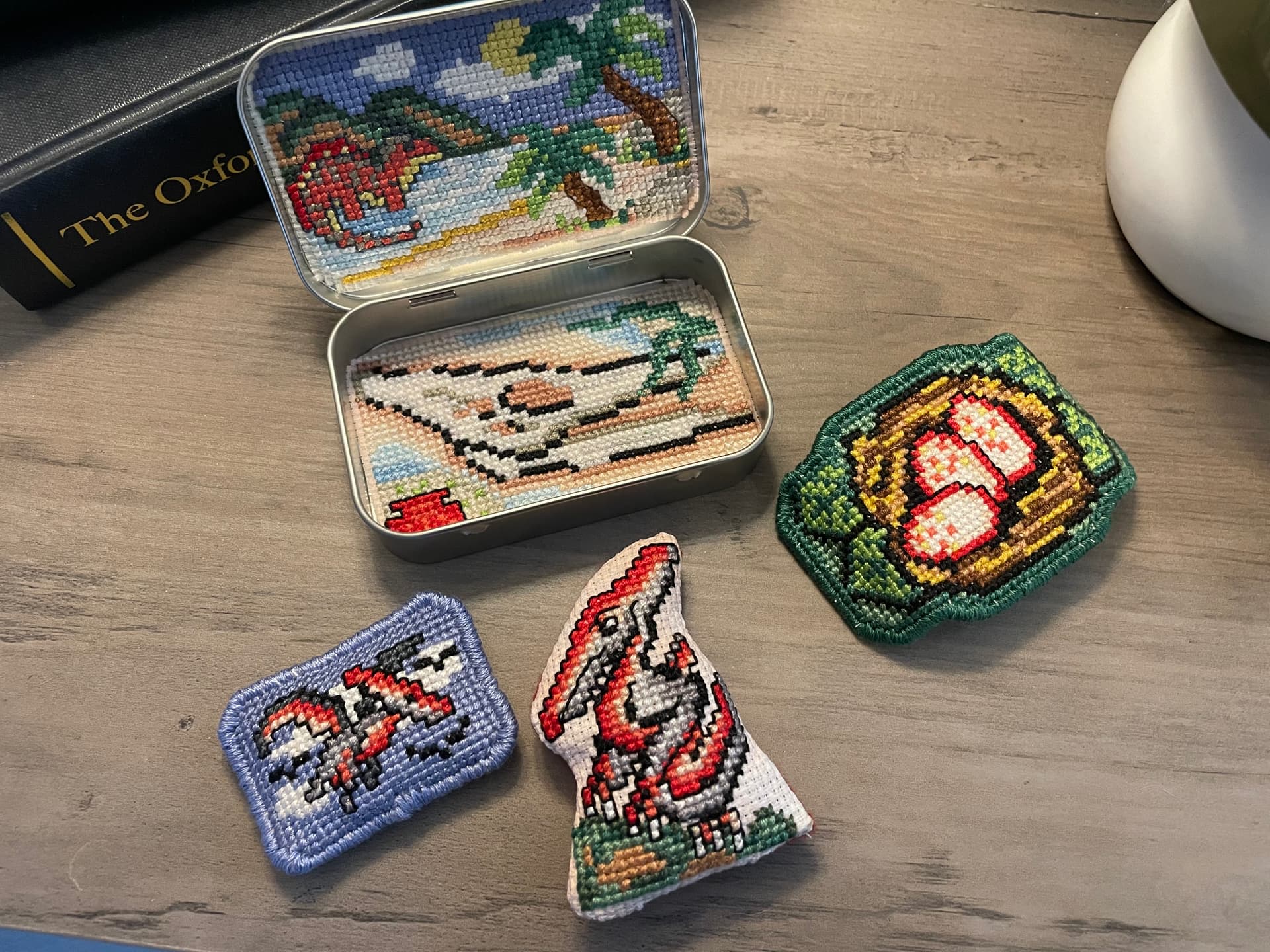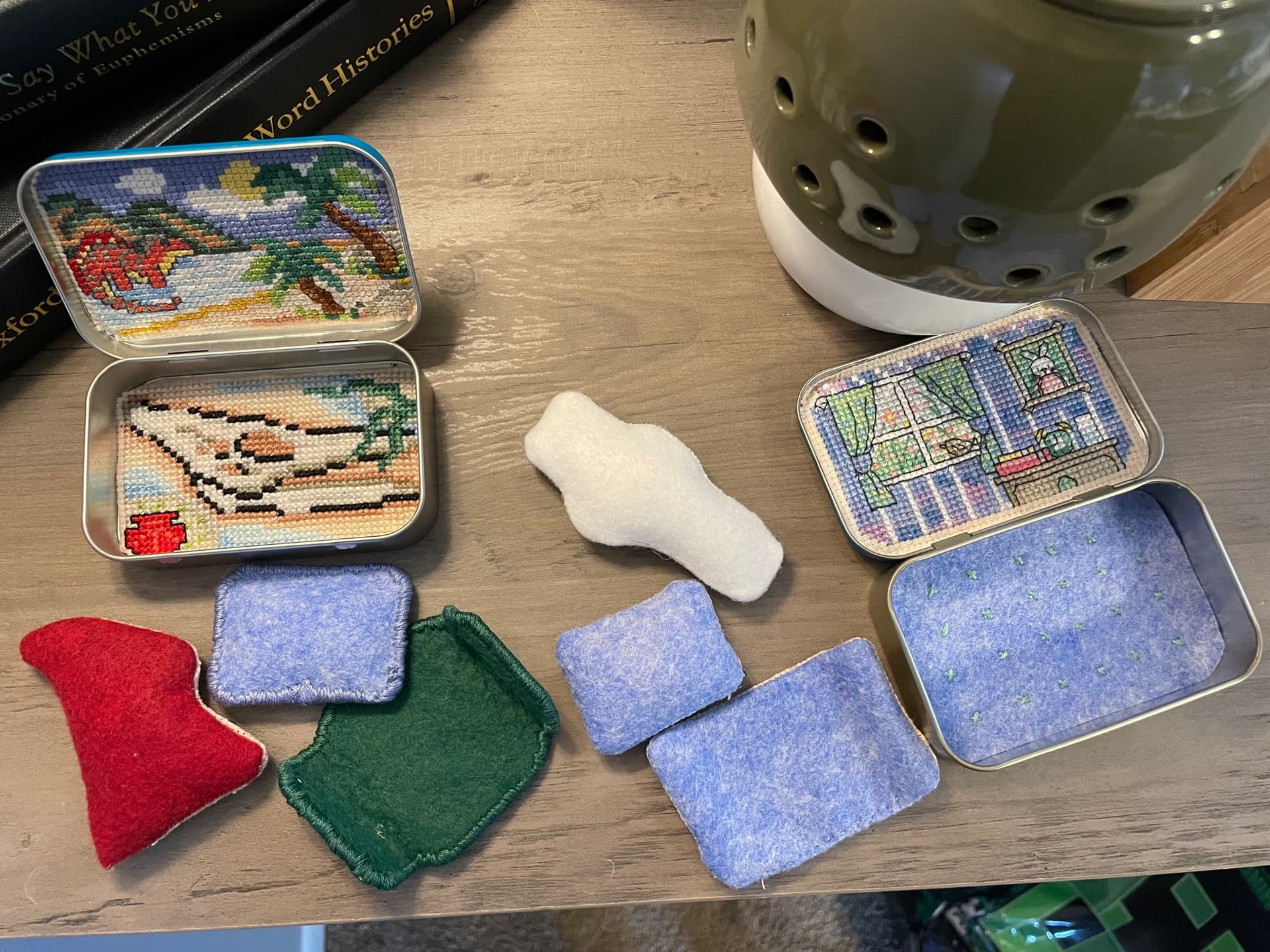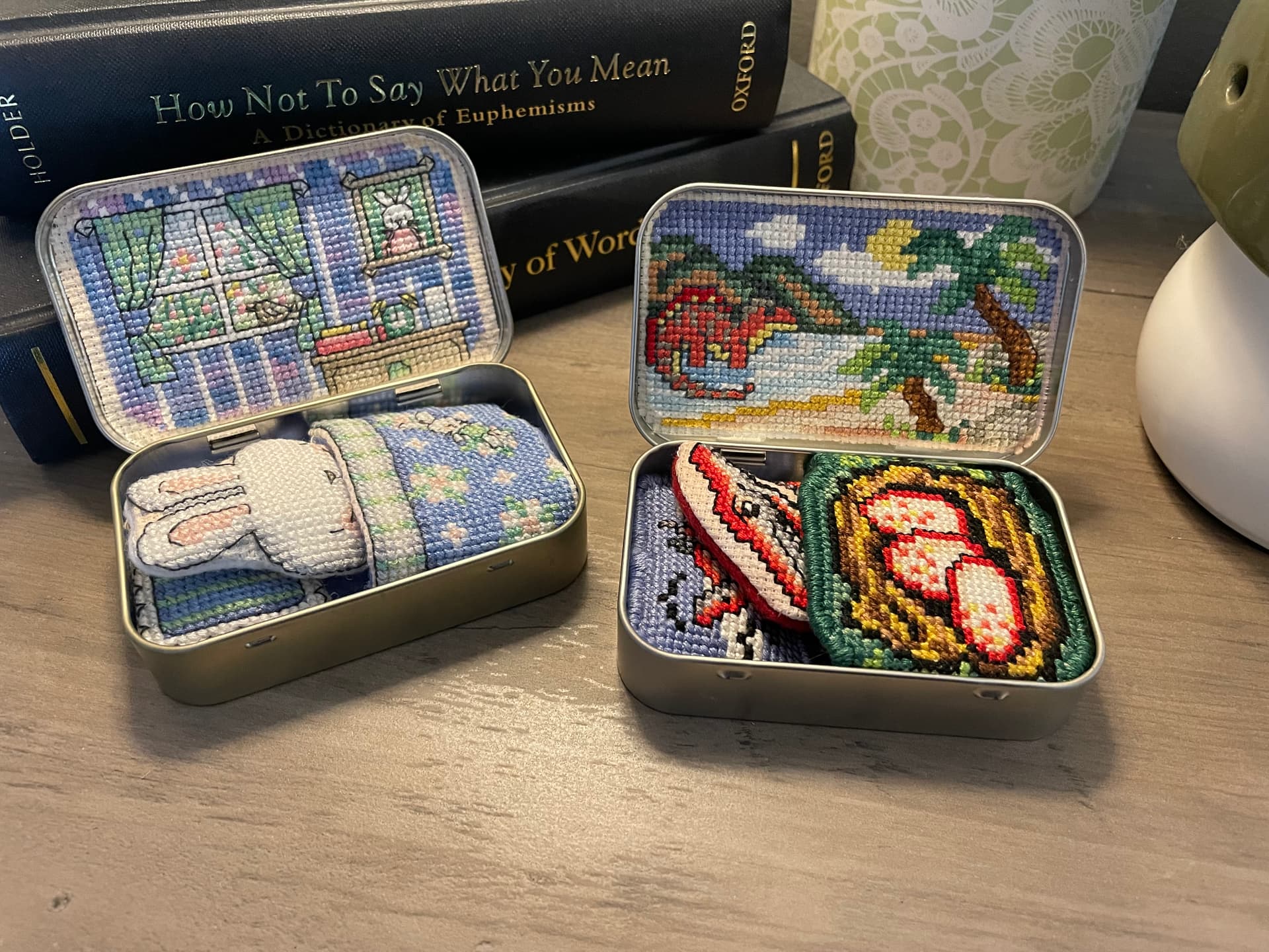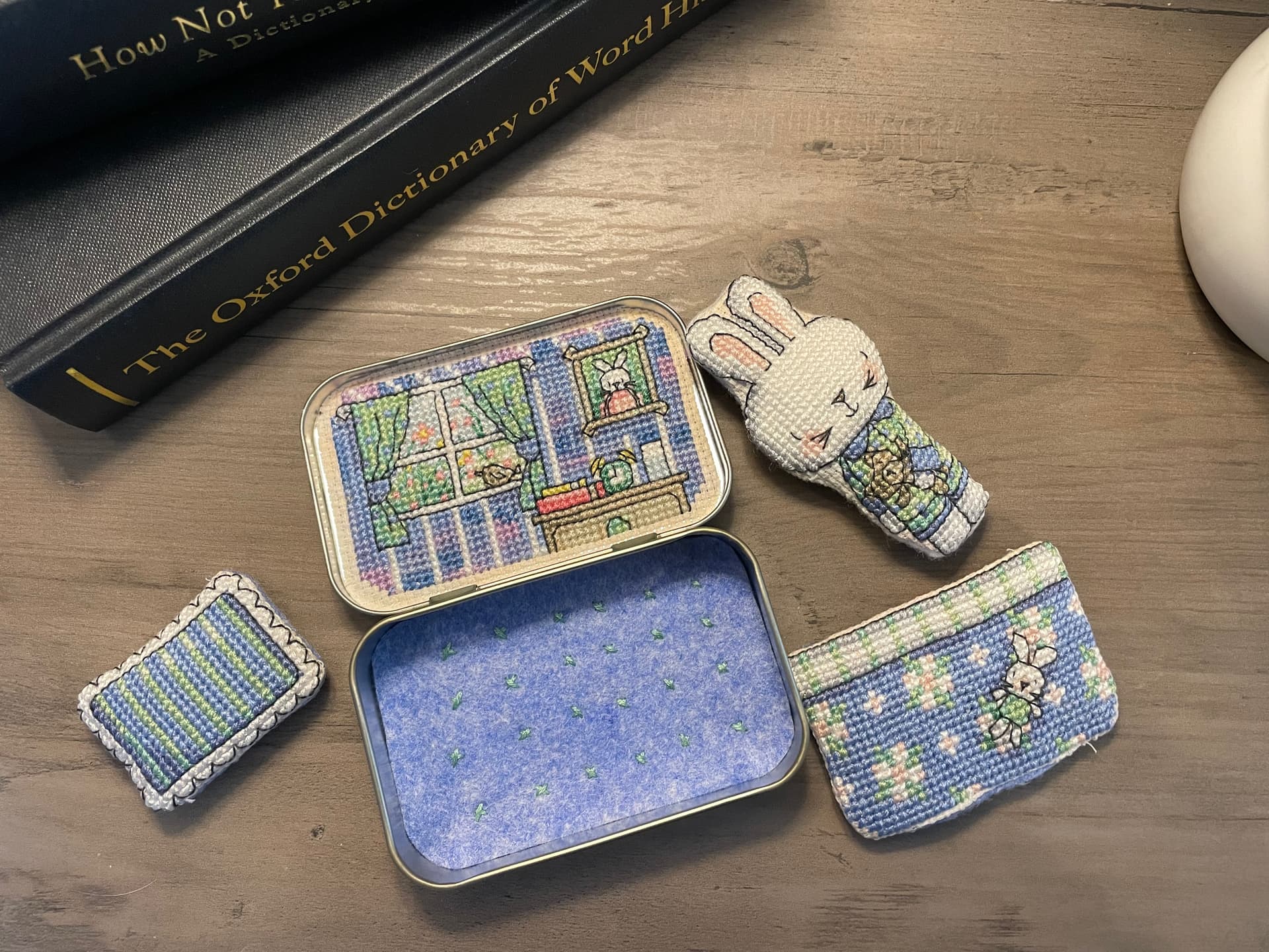 The bunny is from an issue of Cross Stitcher. They have alternative altoid tin bunny scenes too and they’re all adorable. The bunny didn’t have a bottom design so I used felt and little x’s and it kinda looks like a mattress.