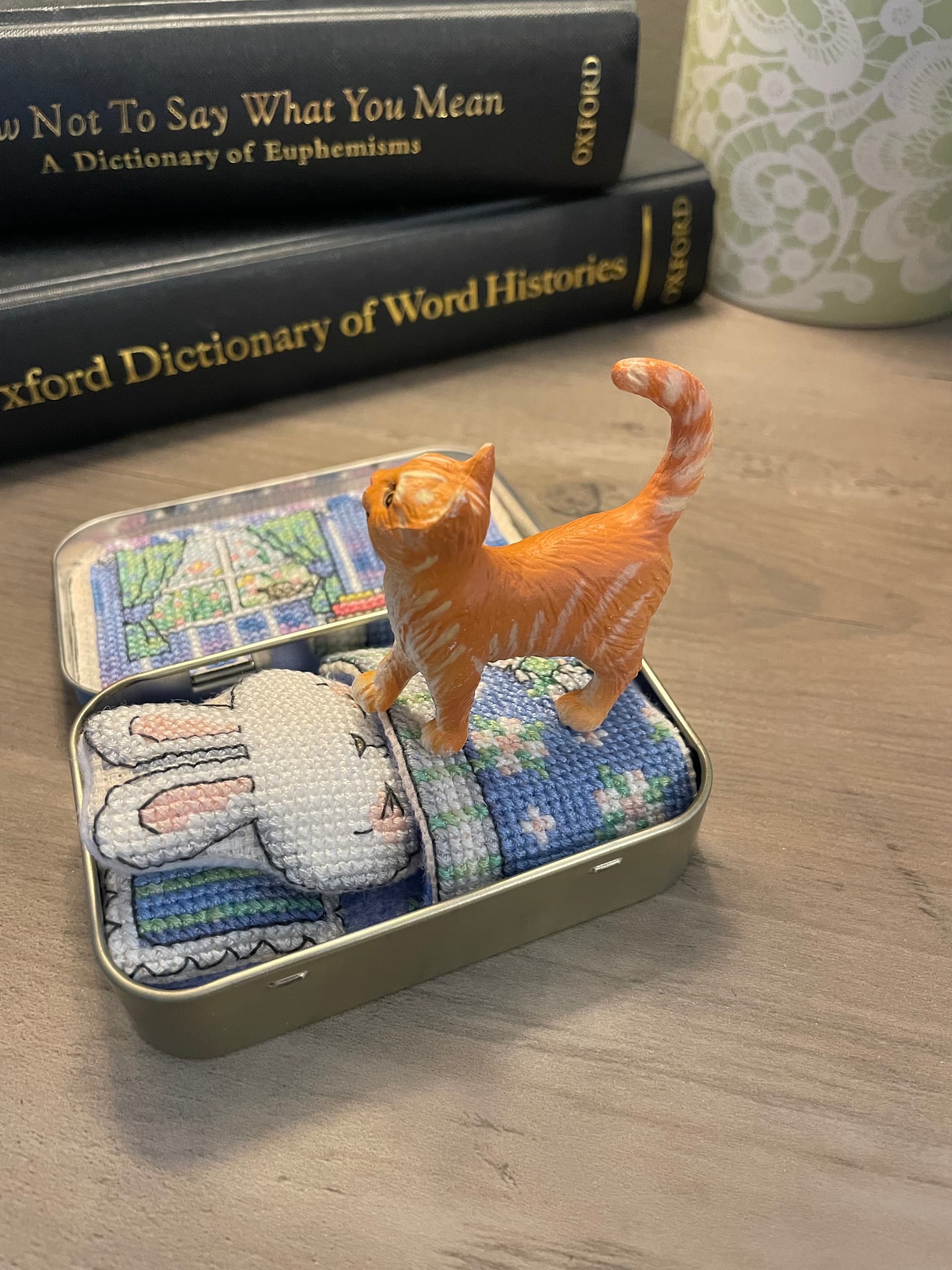 And a bonus picture. My son (who is currently cat obsessed) says this tiny cat figure has to be sent with because “cats always come and stand on your chest when you’re in bed.”