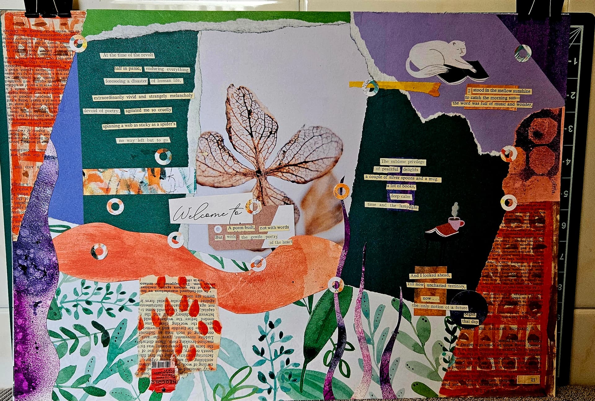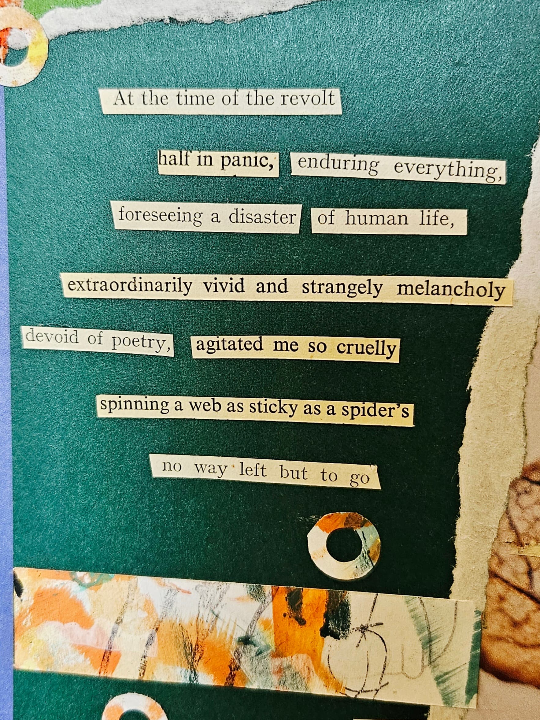 I combined some papers from The Flow Paper Lovers Book with some of my own painted papers, and added text fragments to it to make a cut up poem.