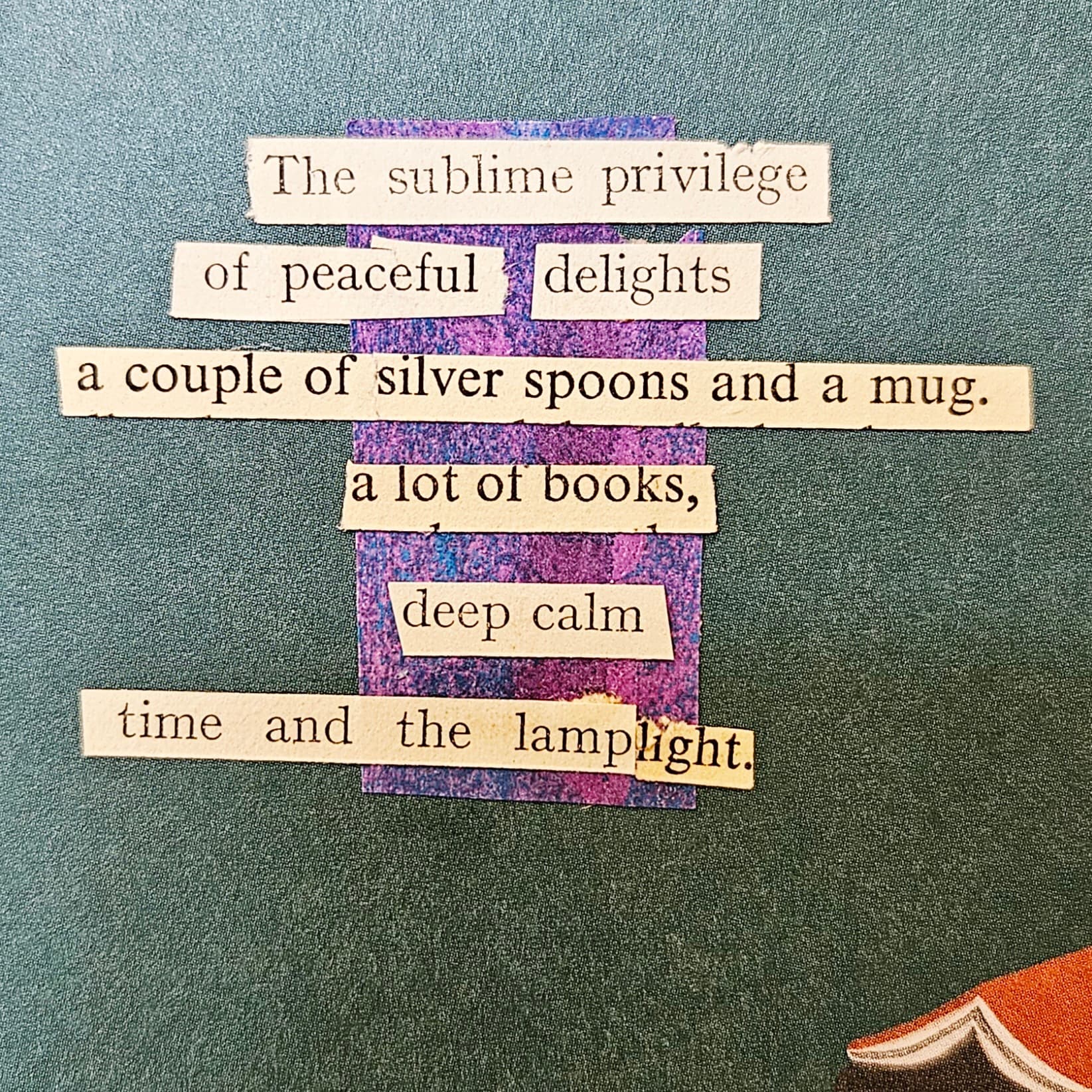I’m part of a coaching group for neurodivergent people, and we have a semi-regular collage session. The most recent theme was Rest, and I remembered that I have a tin of misc phrases I cut out of old books.