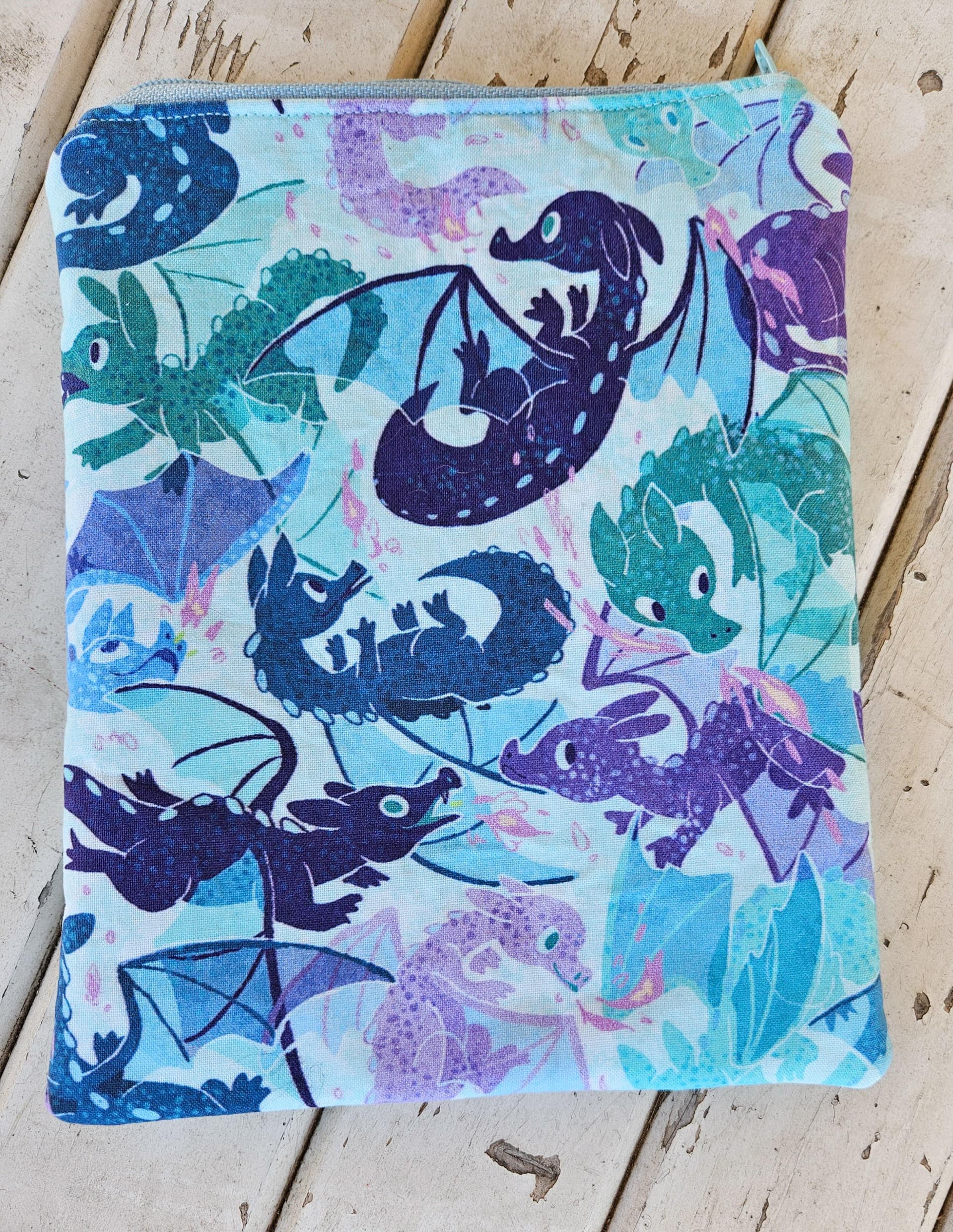 I found this super cute fabric on Spoonflower and ordered a fat quarter. My mom loves dragons and I knew she’d adore it. I settled on making her a kindle pouch as she’s an avid reader.