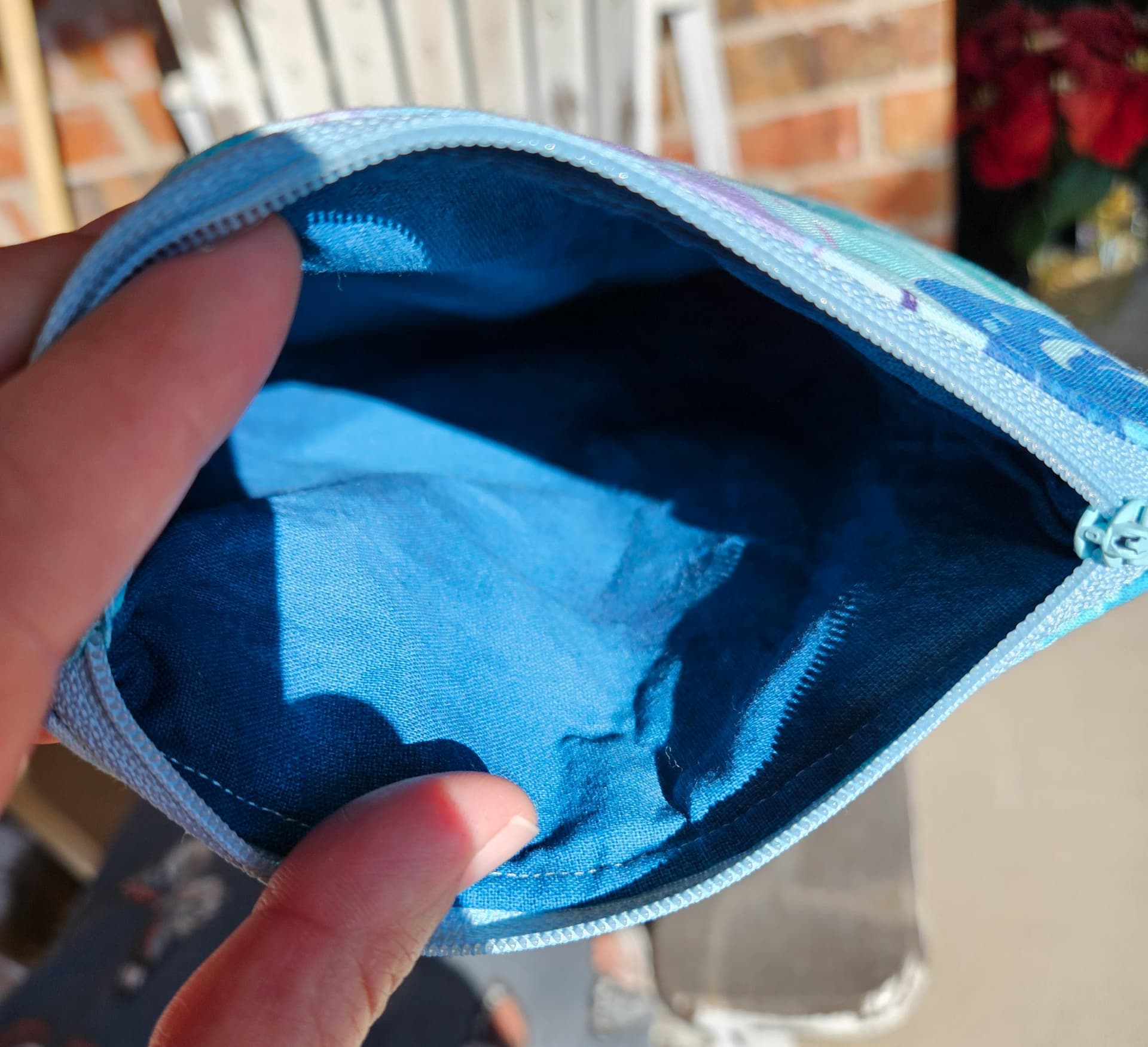 The lining is a mottled medium blue that works well with the main fabric colors. I used stabilizer on the exterior and liner fabrics and some thin batting.