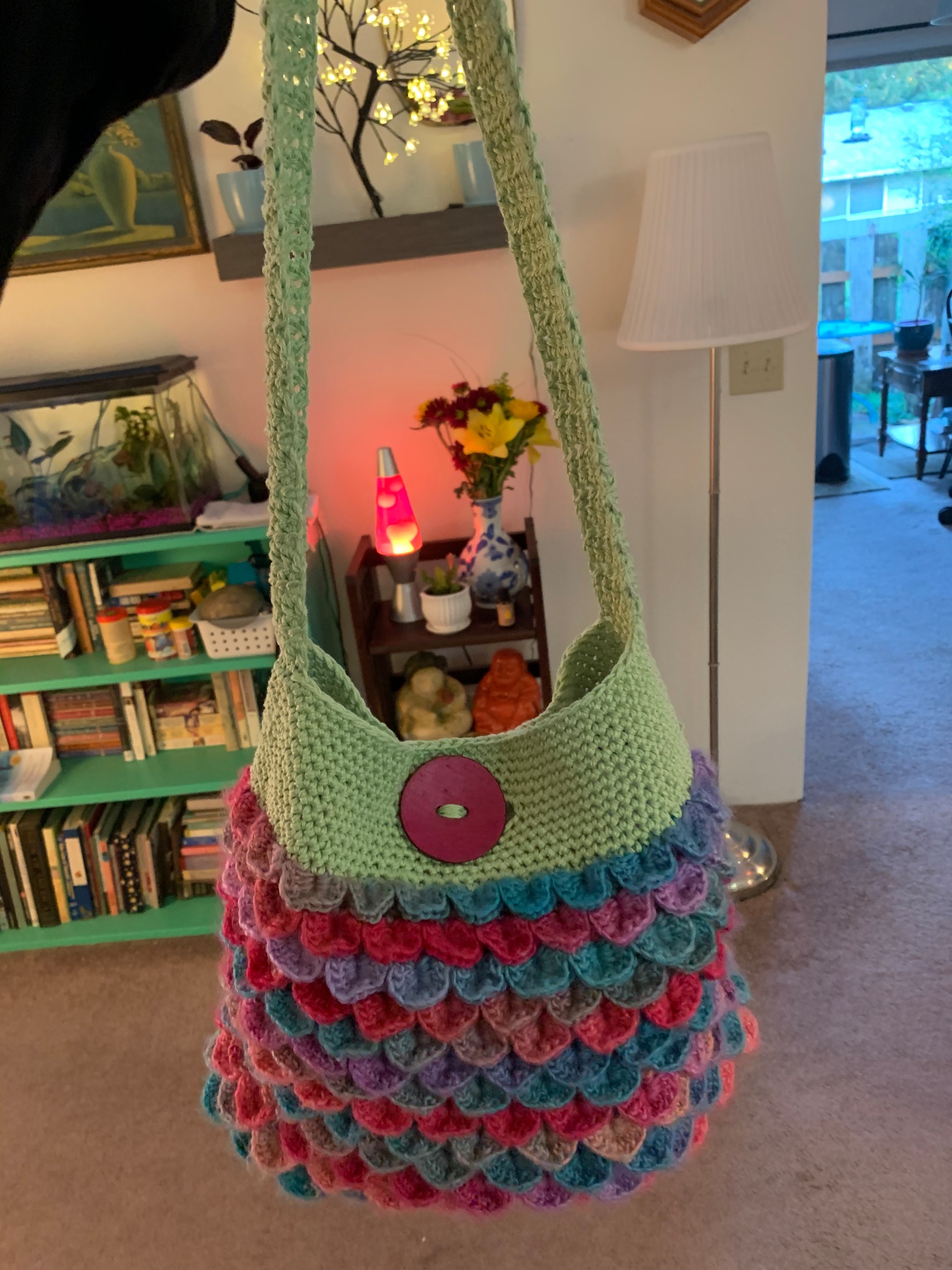 This bag looks so squishy! I really like the colors you chose, too. I have yet to attempt the crocodile stitch, but I have a couple of patterns that use it. Was it a slow stitch to work? I’ve heard it’s a yarn gobbler.