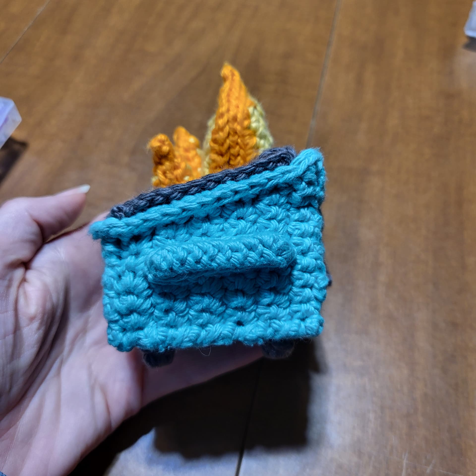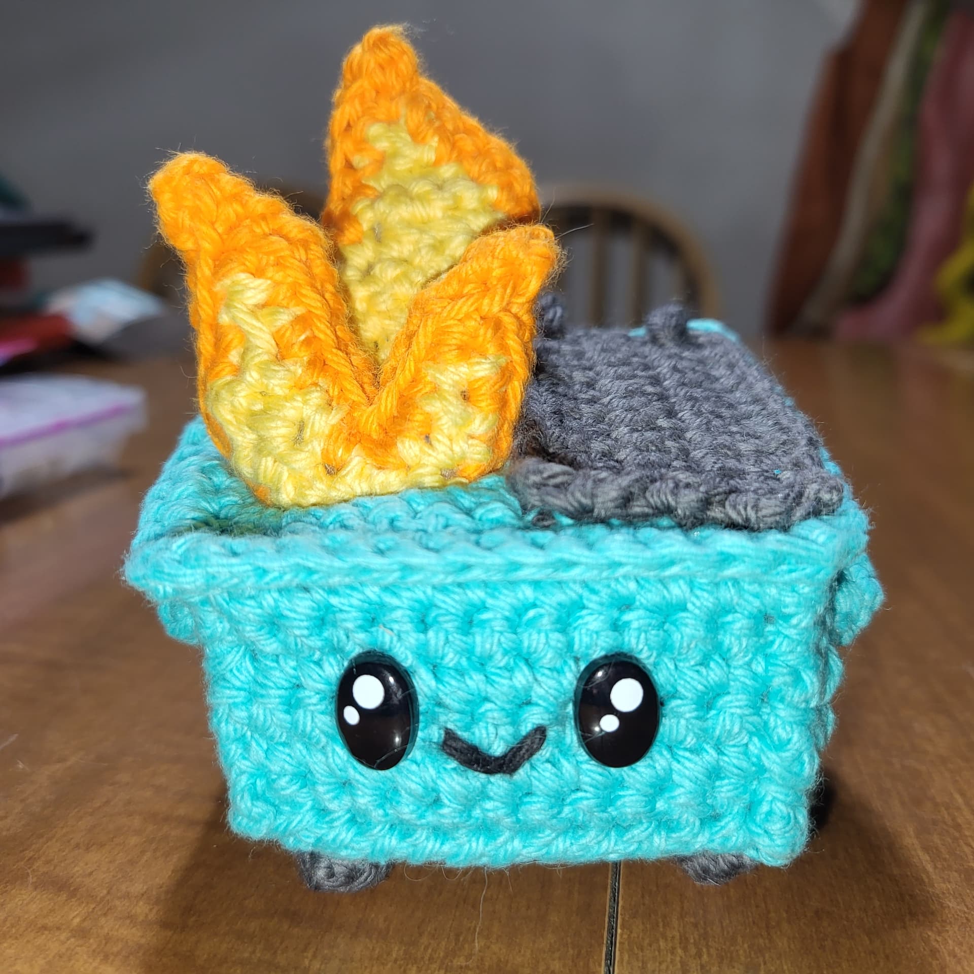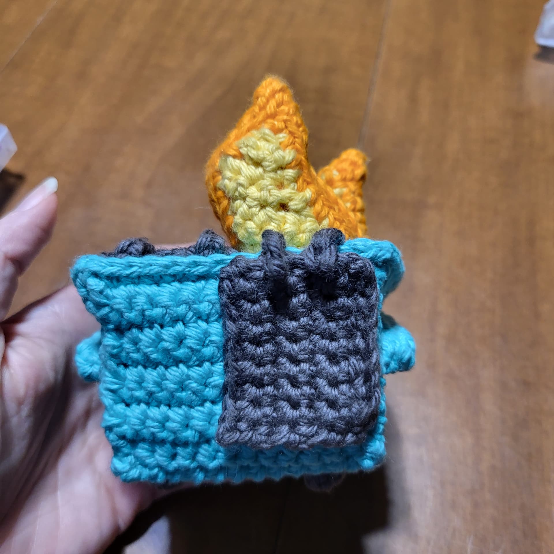 My coworker requested a dumpster fire for her birthday. This is the pattern by Twinkie Chan. It has a million and one pieces to sew together, so it took forever! But I think it turned out pretty cute.