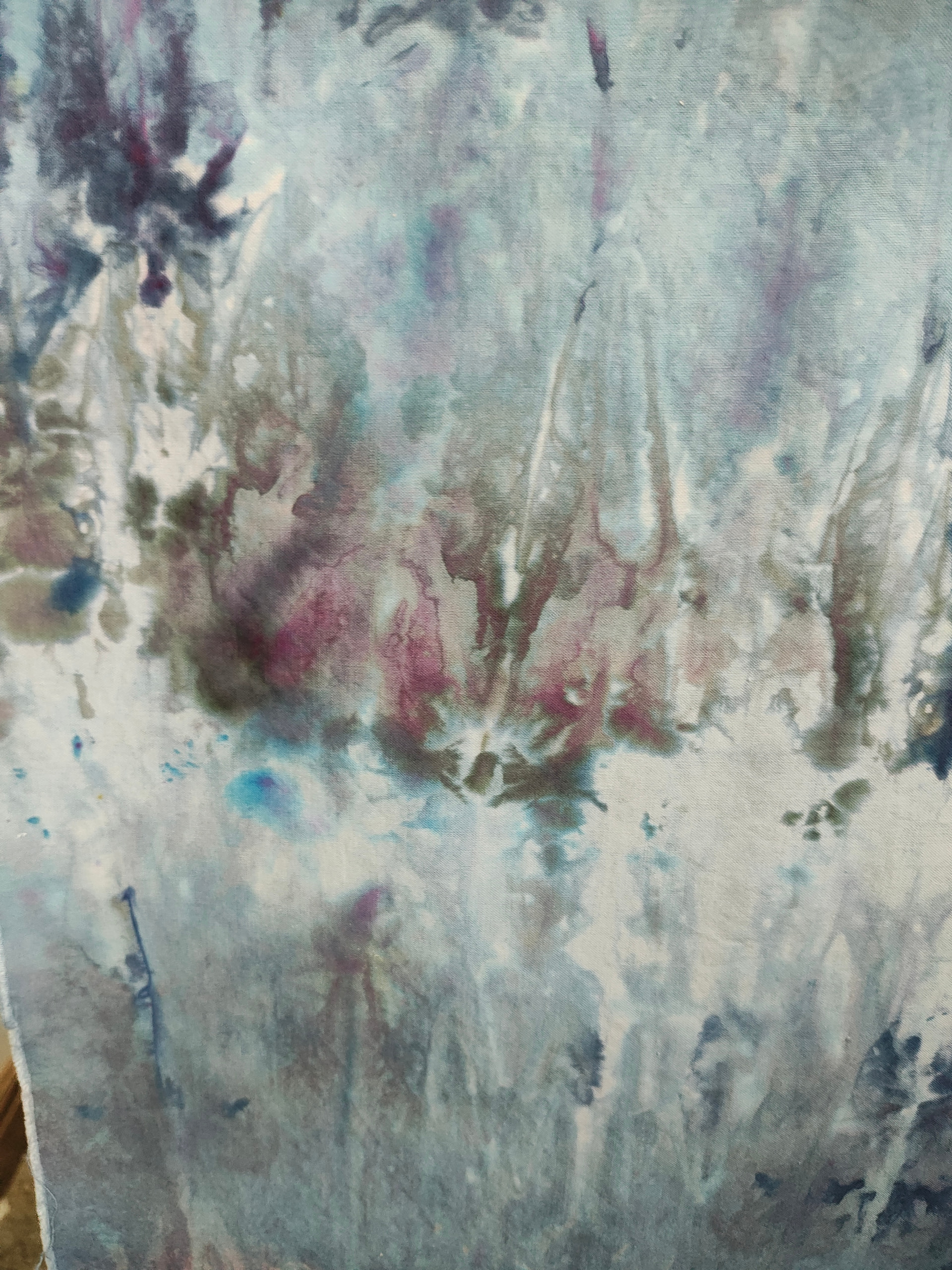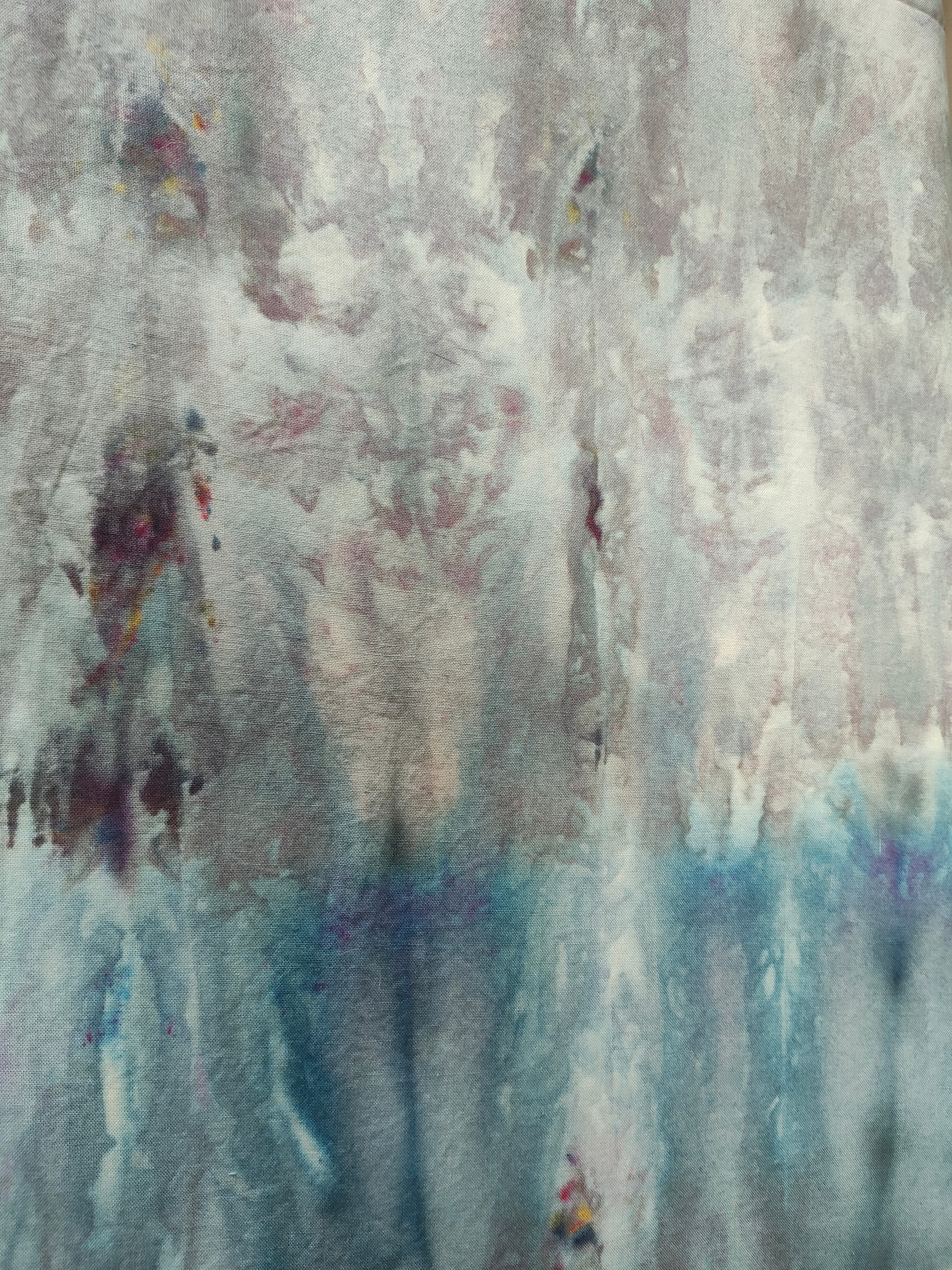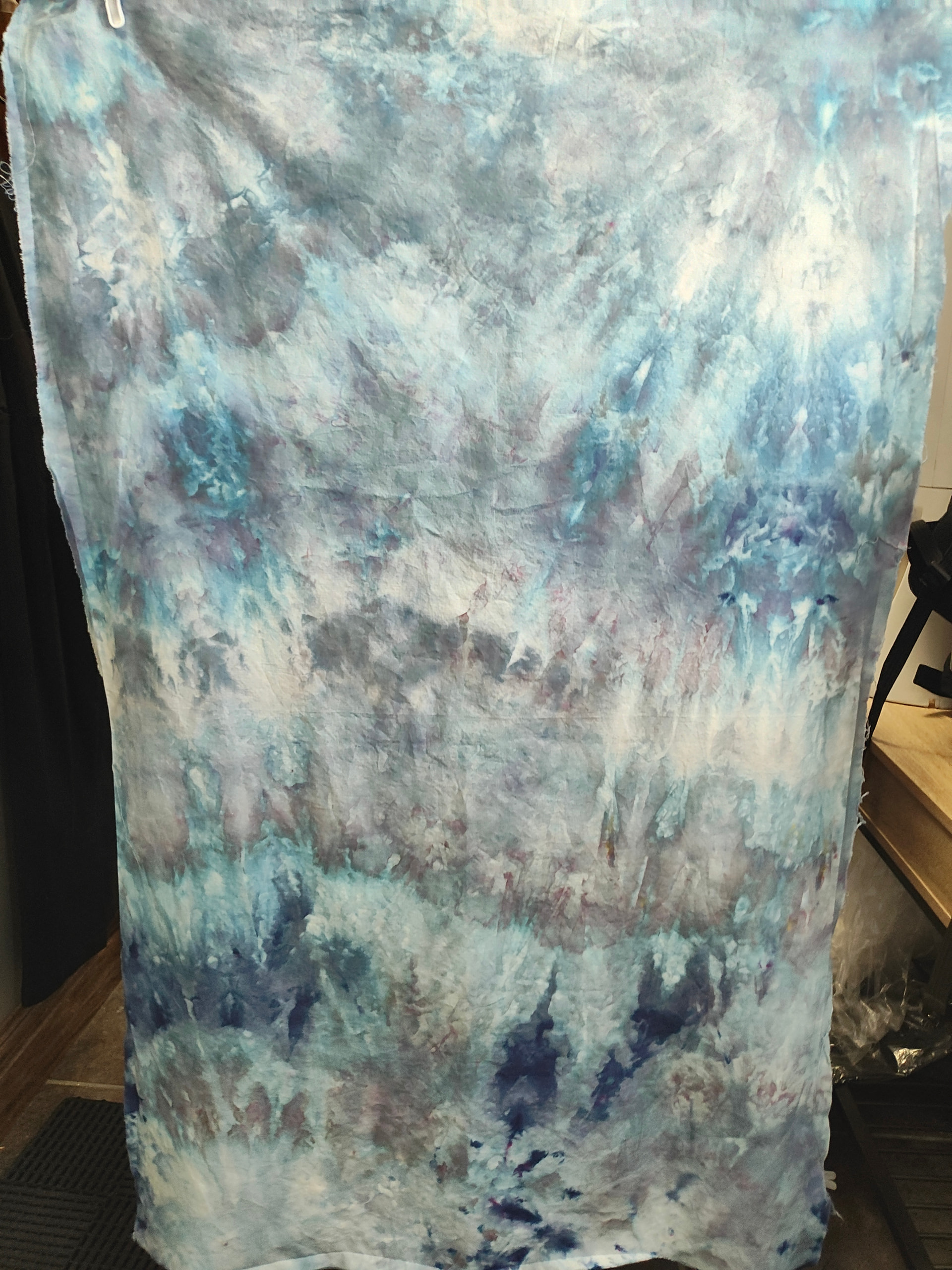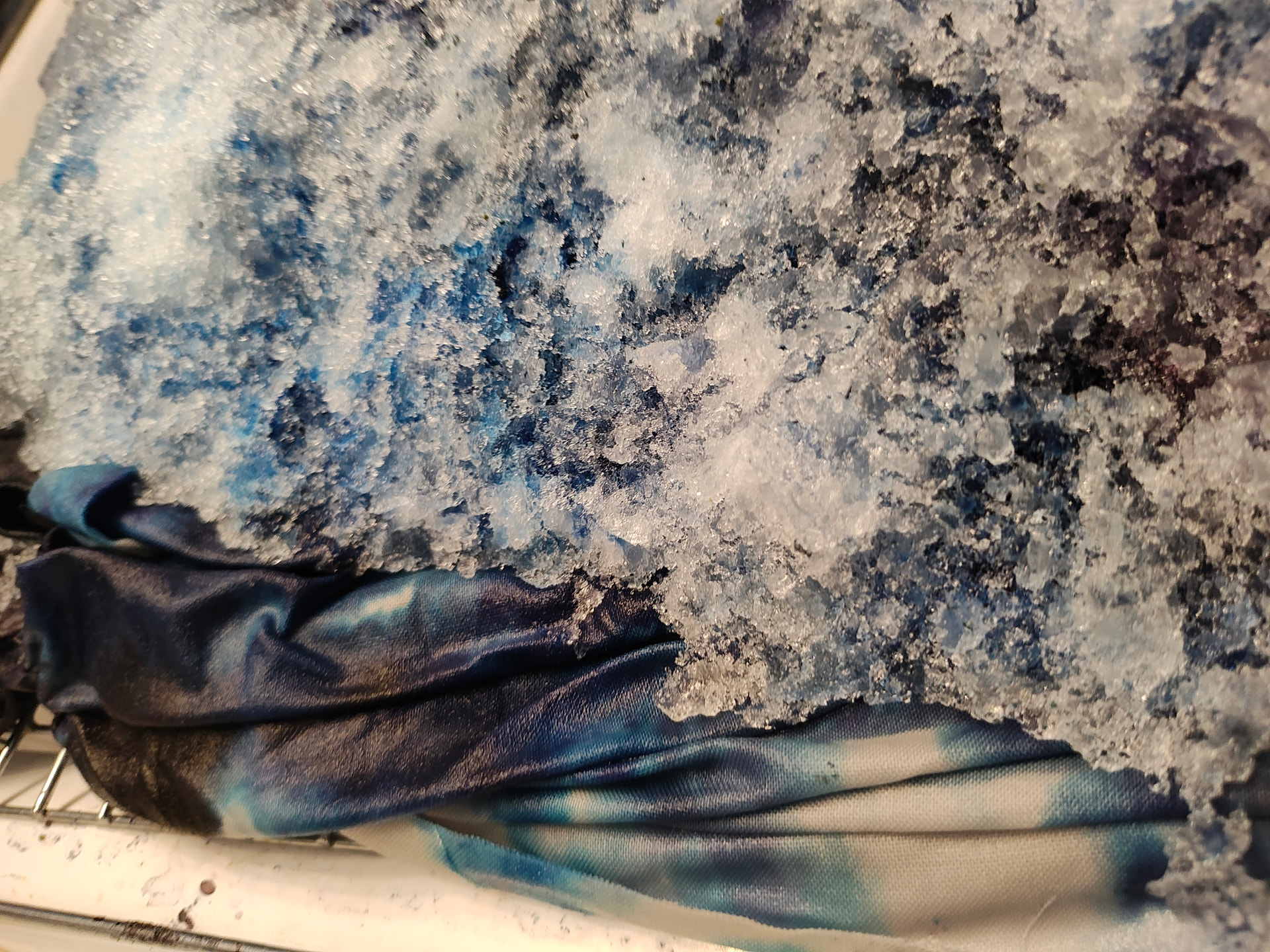 All procion dyes from Dharma Trading. Colours include silver lining, charcoal, cerulean blue, sapphire blue, deep space and a sprinkle of black on the first layer of snow. That’s where some of the yellows and reds come from. Cracked black. I it.