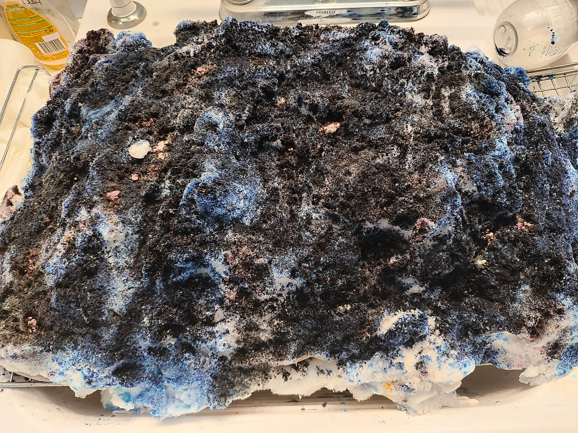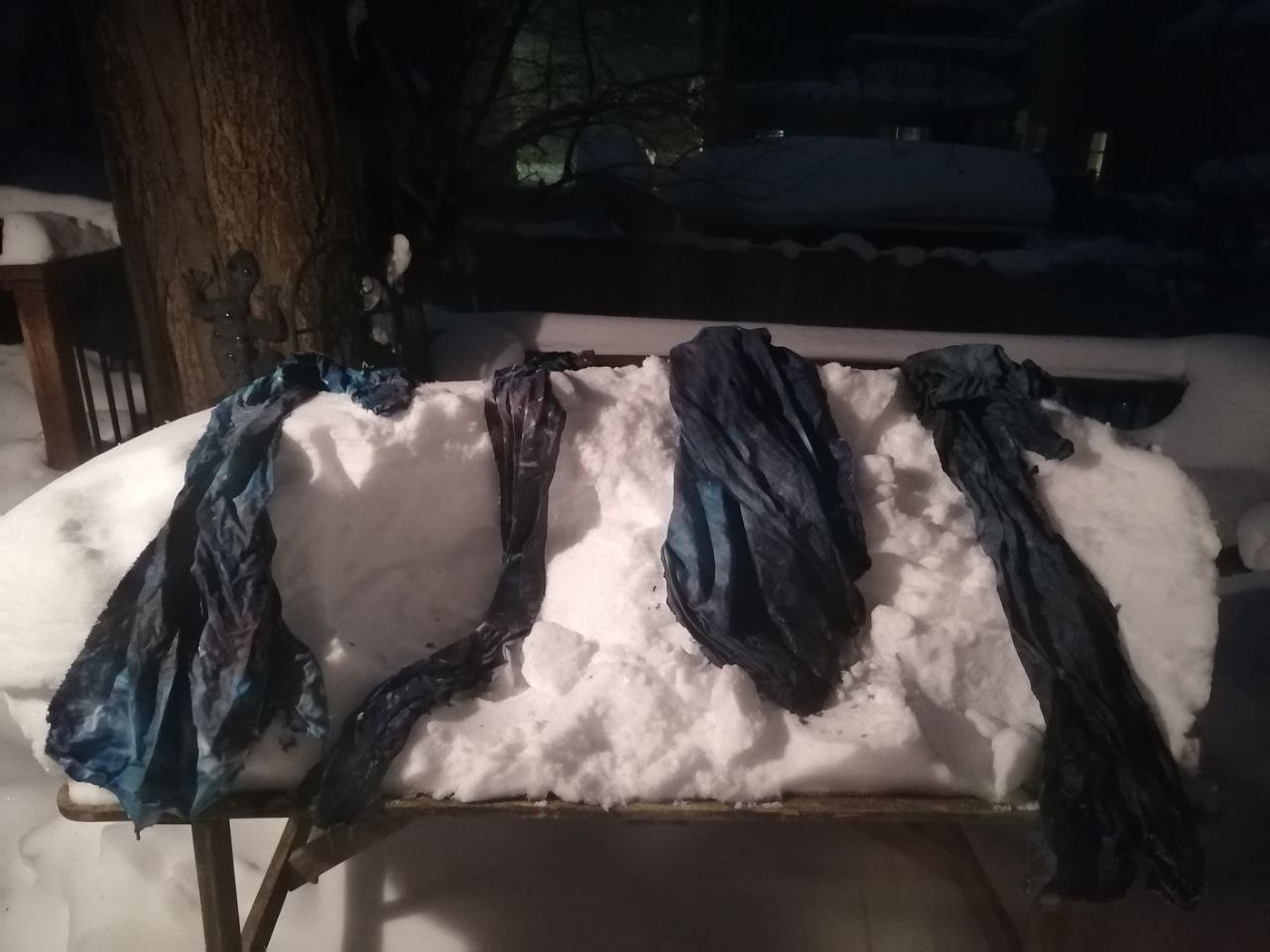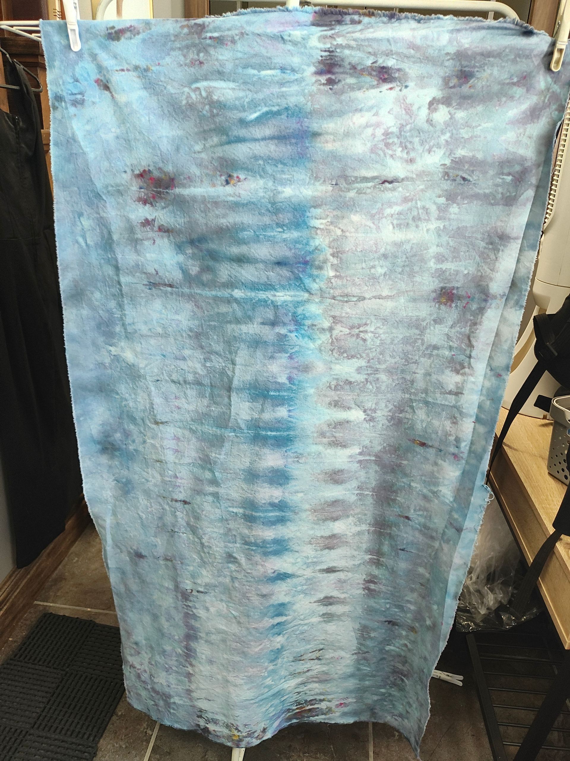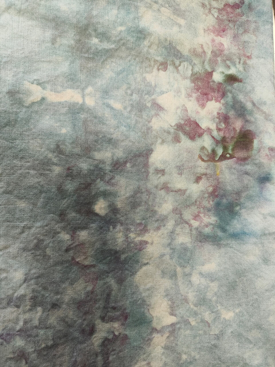 All procion dyes from Dharma Trading. Colours include silver lining, charcoal, cerulean blue, sapphire blue, deep space and a sprinkle of black on the first layer of snow. That’s where some of the yellows and reds come from. Cracked black. I it.