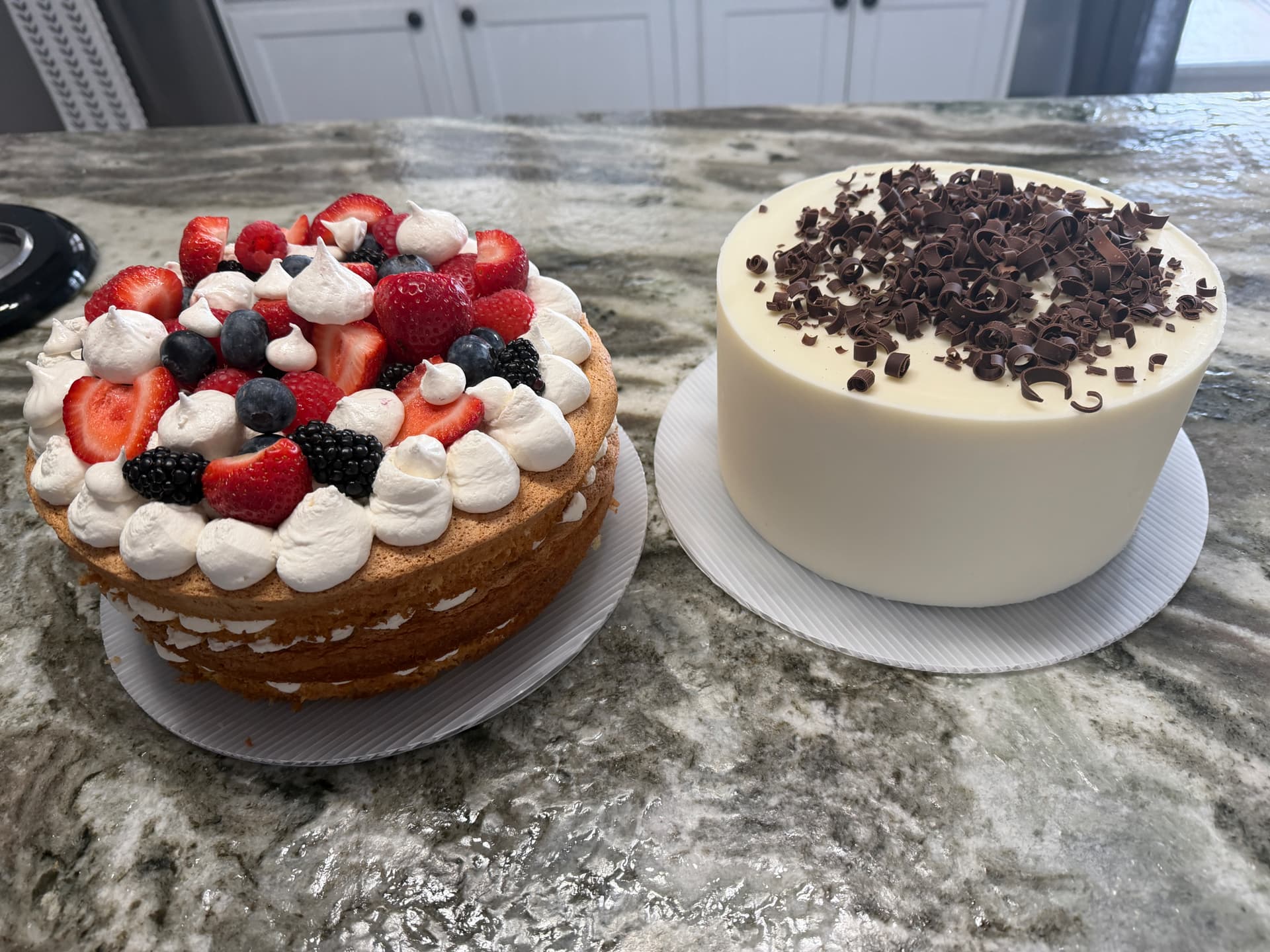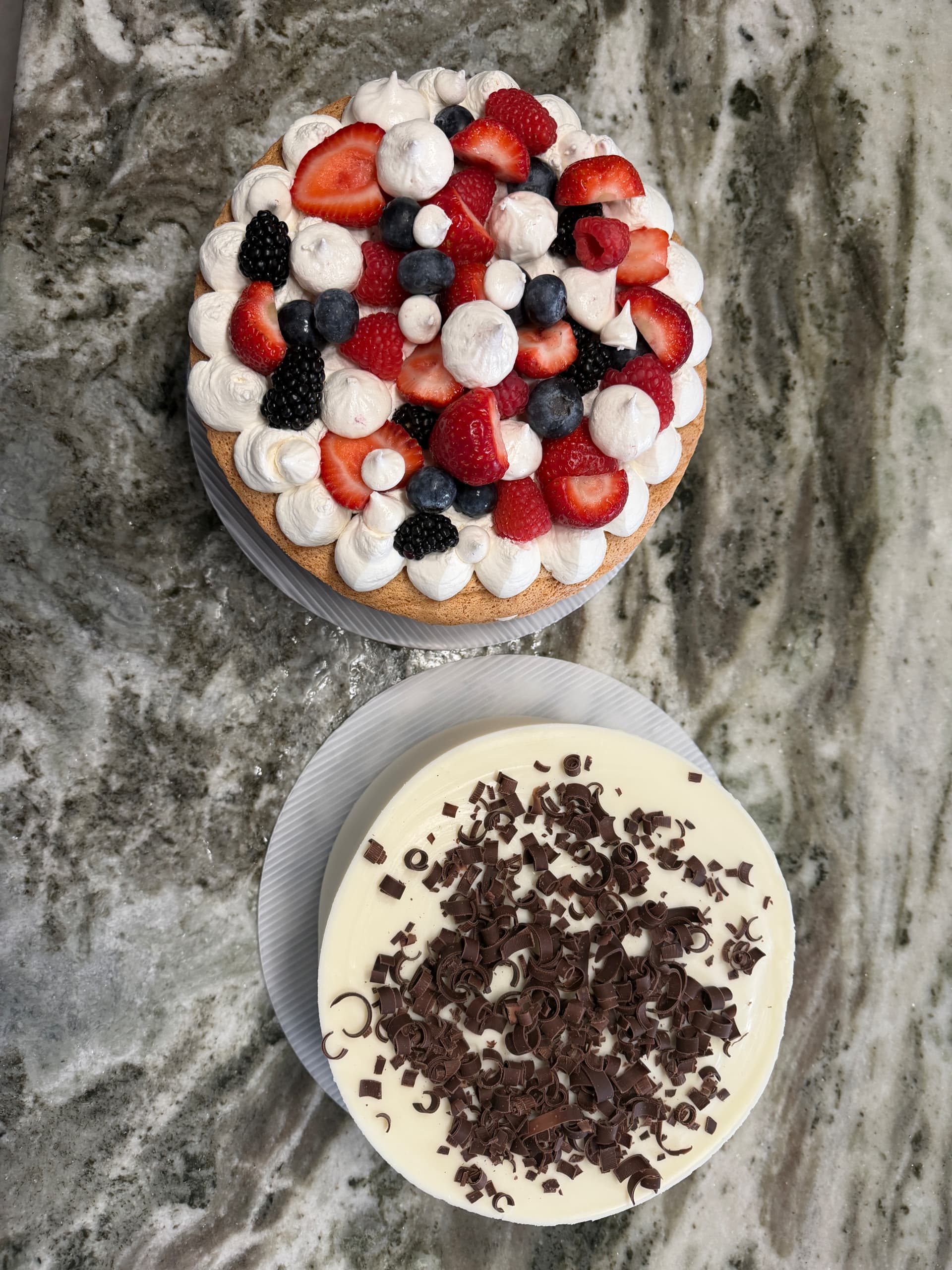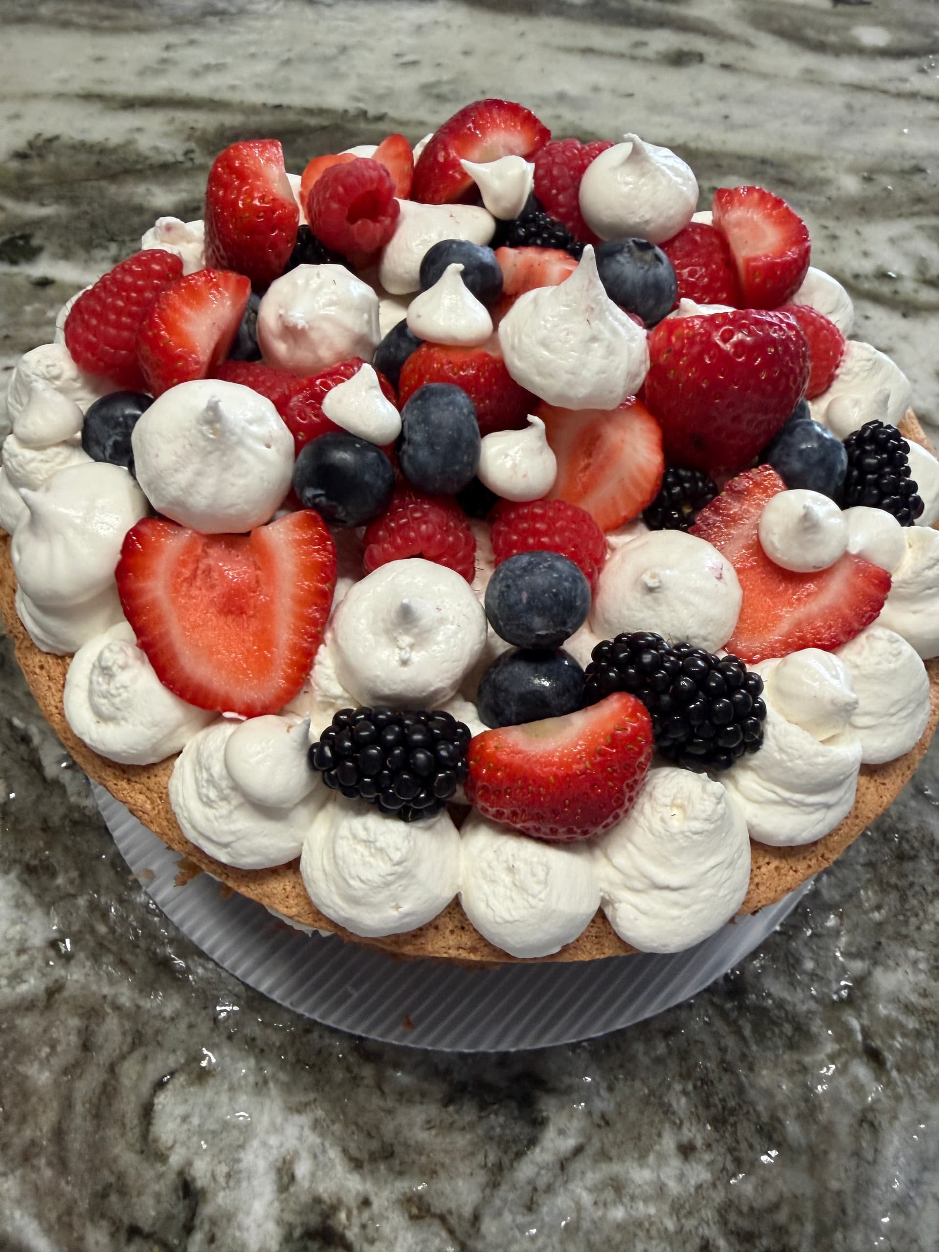 On the very top of the cake, spread on the remaining whipped cream. Top with berries and meringues kisses.