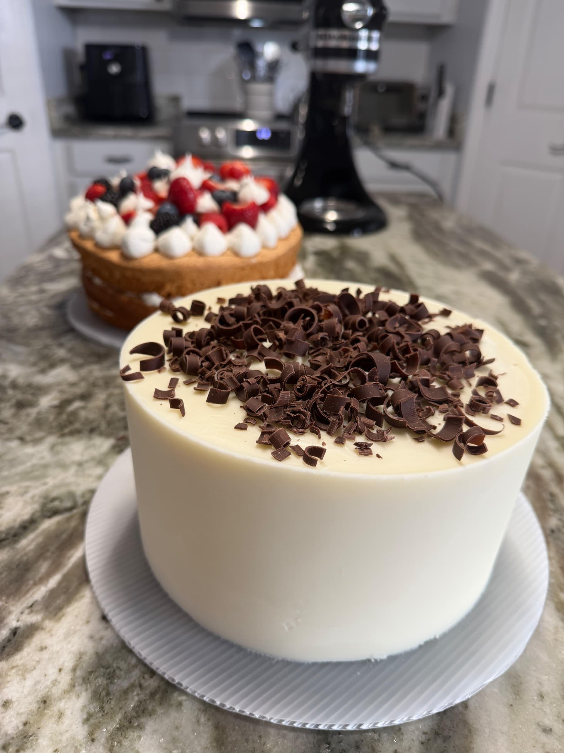 I made 2 cakes for January work birthdays, an Eton mess and a red velvet. Red velvet was made with a box mix, but I did make the cream cheese frosting and used Frost Form’s white chocolate ganache frosting. The frost form was very easy to use but you need to be patient. Chilling the cakes and cooling the ganache are keys to success also, leave it in the form overnight to make releasing the acrylic liner easier.