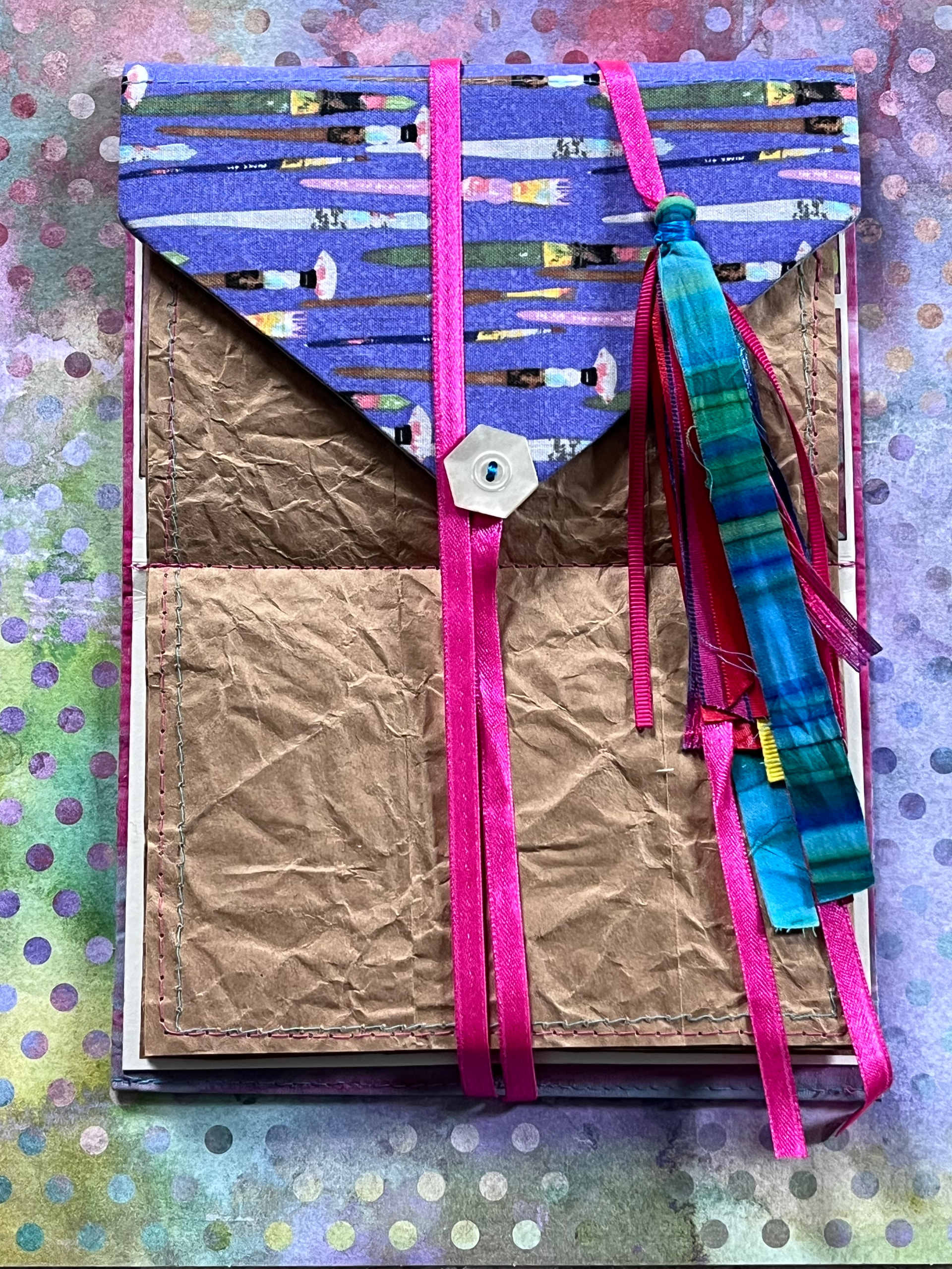 Made for @Edel for Positive Affirmations R-5 , fabric covered cardboard with washed brown paper bag pages, machine stitched.