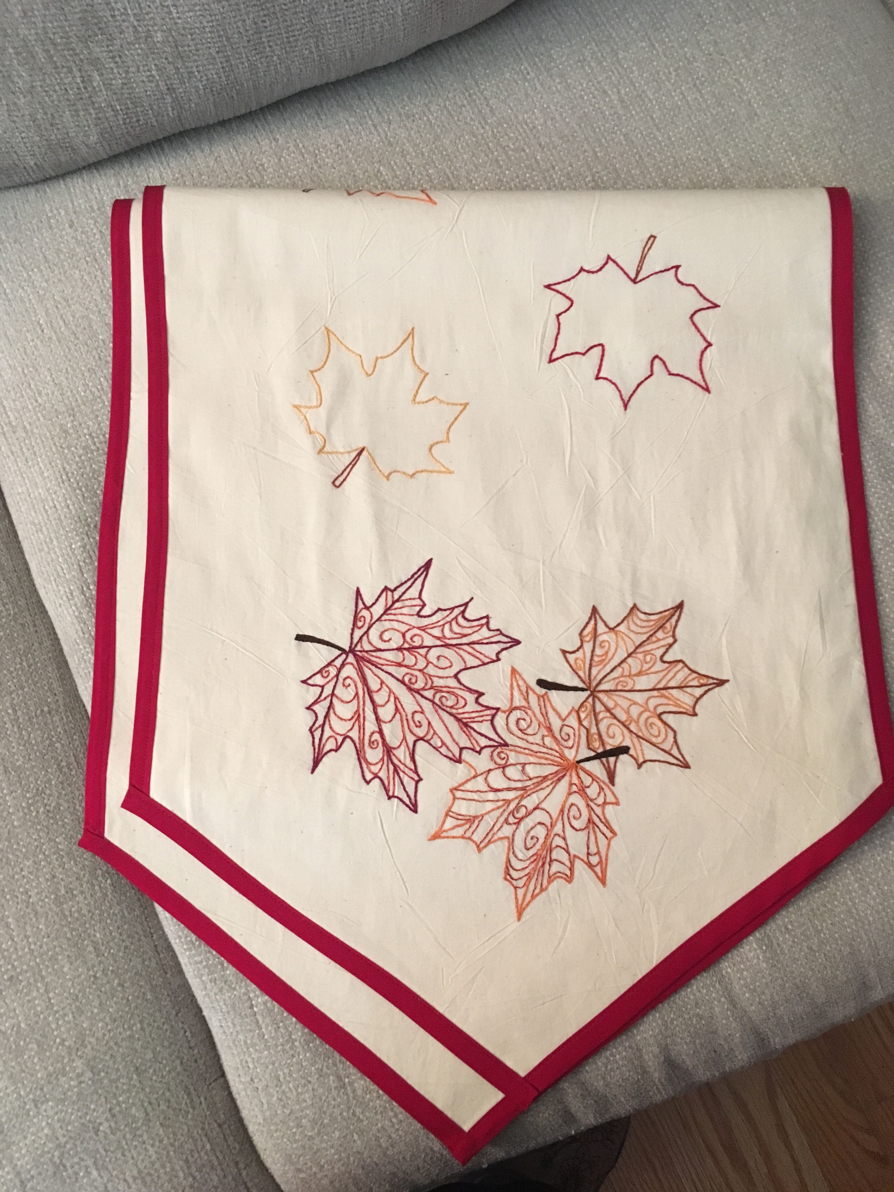I made this table-runner out of some unbleached muslin that my husband used as curtains before we moved in together. I twisted two strands of different-colored thread together to stitch the swirls in the leaf clusters at the ends, and used a single color for the leaf outlines along the runner itself. Used at Thanksgiving and has weathered a few gravy stains just fine!