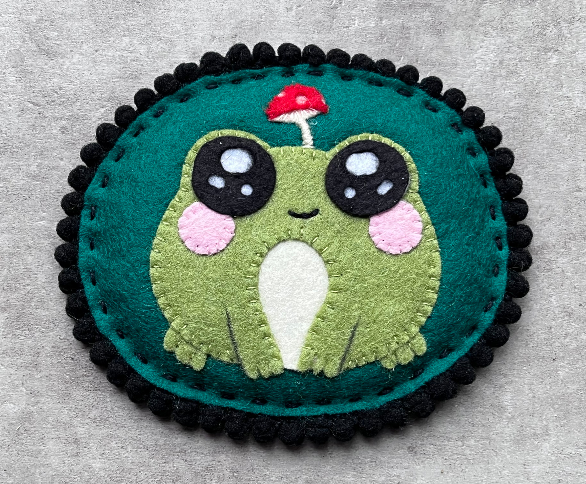 I found this cute frog image online when researching her Q and could not resist him with his adorable wee fungi cap. My favourite part though is the mini pom-pom trim, I love that stuff.