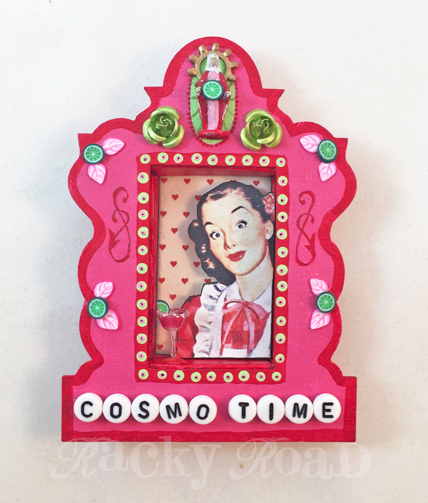 The first shrine I did was all about Cosmopolitan martinis, so I painted the exterior a bright pink with a red border. It’s embellished with polymer clay limes and pink leaves, and the niche features a miniature Cosmo drink. The small metal saint is painted in Cosmo colors, and she’s offering up a slice of lime! This shrine will be the perfect addition to the Cosmo shelf in my kitchen.