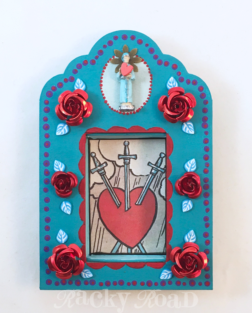 My next shrine was made before the Corona virus threat got real, but in light of all the news of the hour, I’m calling this one the “I See Coronavirus” shrine. I used a small loteria card for the niche, and a bright red eyeball at the top. The eye sits on a round filigree setting. I painted the tiny flowers on the filigree to match the colors of the shrine border. The perfect black lines are Dazzles Thin Line stickers.