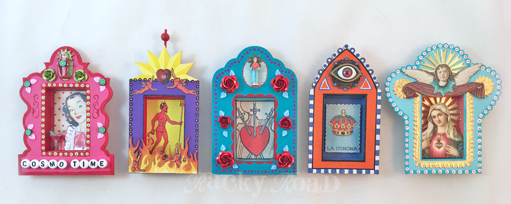 I love the bright colors of Mexican folk art, and I love making little shrines, so these little matchbox shrine facades that just came out at Alpha Stamps make me so happy. For the past week or two, I have been busy making shrines. All the bright colors! The fronts are chipboard, while the little niches are matchboxes. (I have so many extra matches now!)