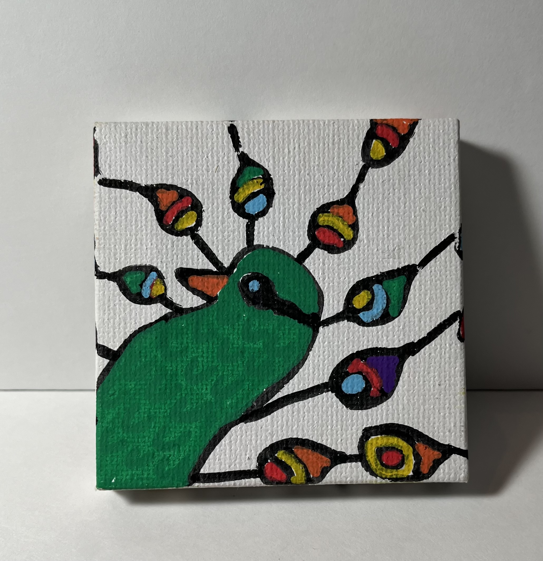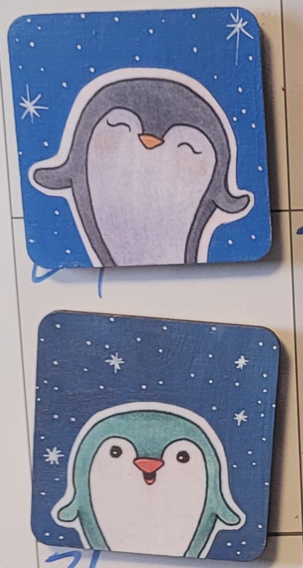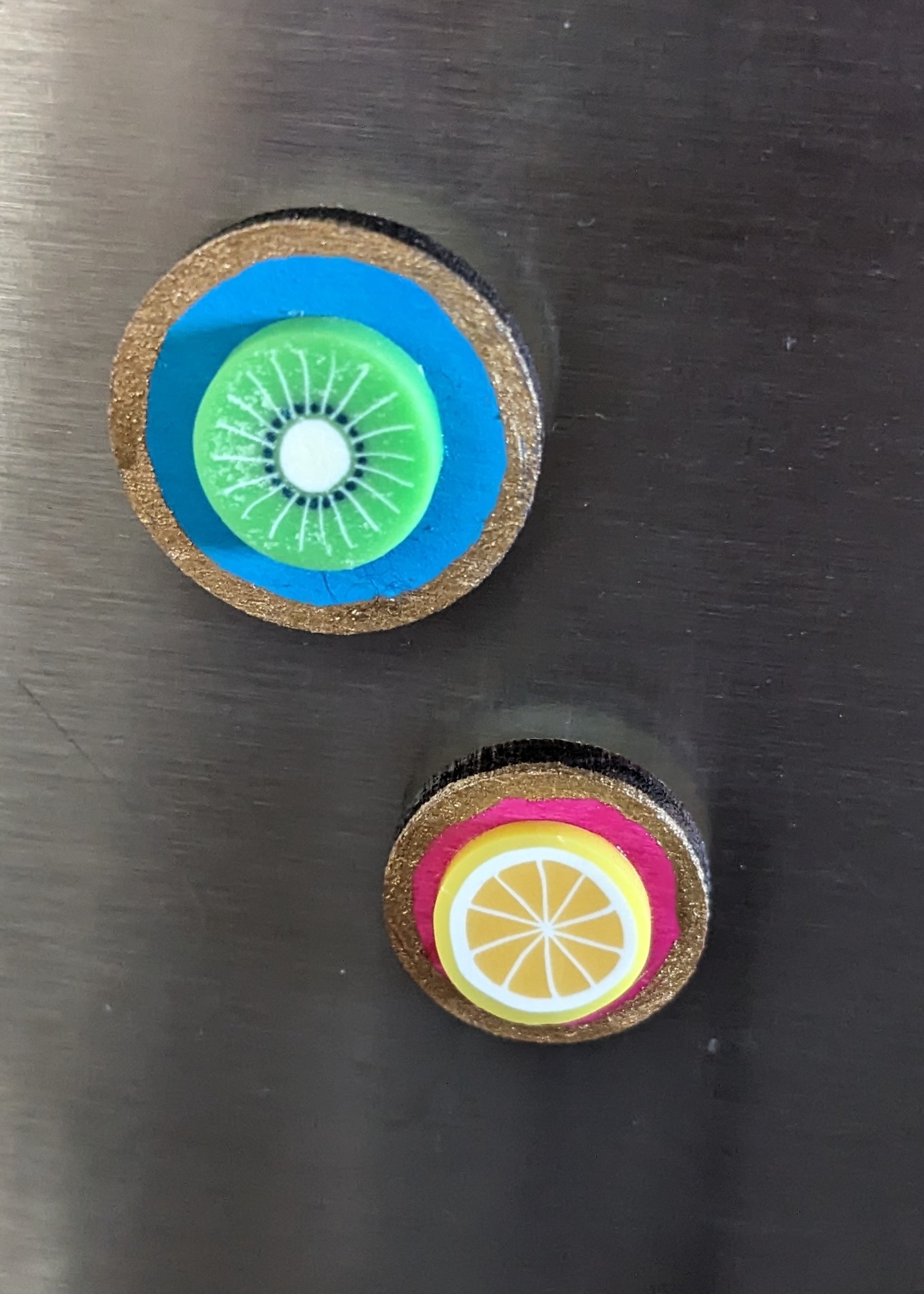 Two lil fruits! Lemon and kiwi! They’re on little wooden circles. My son really loves the lemon. He was telling us this evening about a meme he saw where a kiwi bird was eating a kiwi fruit and it said “cannibalism” on it. This was followed by my husband showing him a video of a kiwi roaring. Their noise is unsettling for such a cute looking bird. Kinda likes koalas.