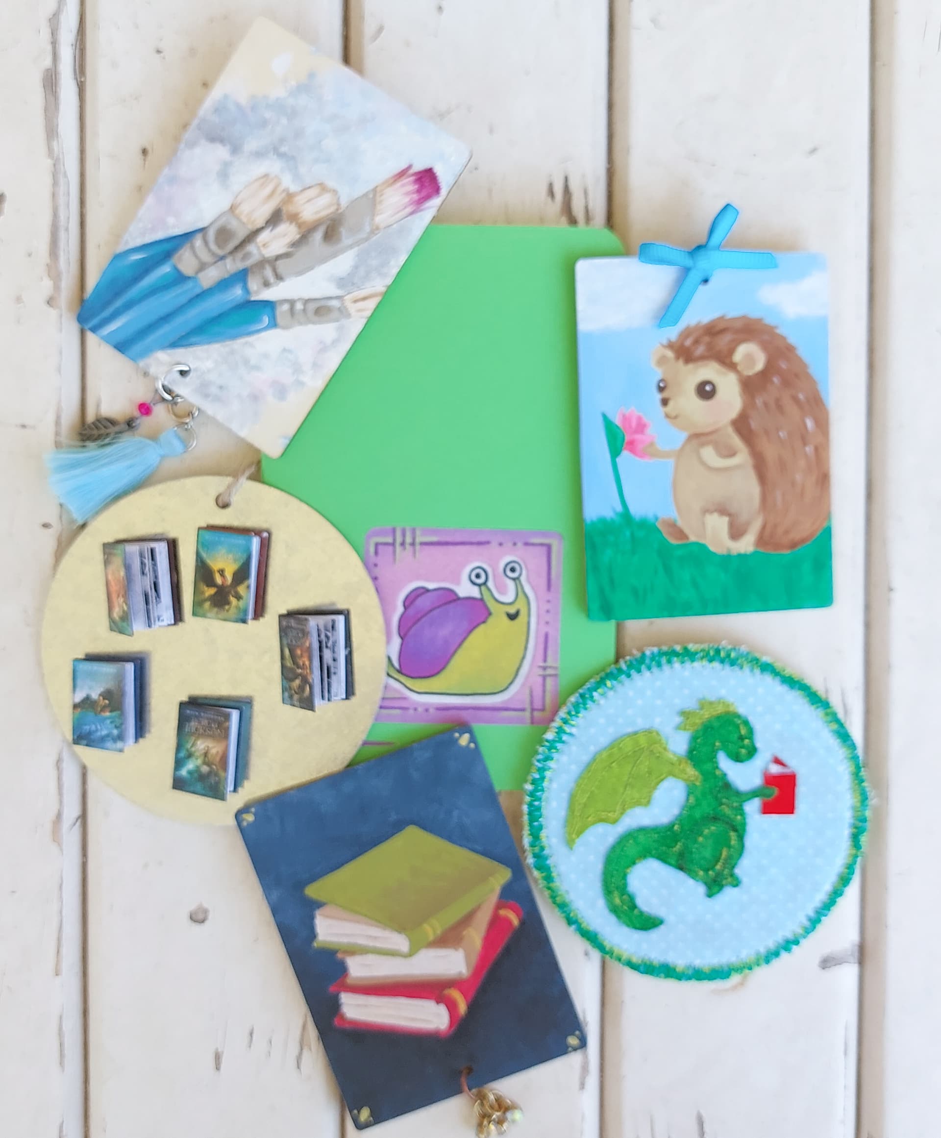 The fabric book dragon, art brushes, adorable hedgie, and book stack