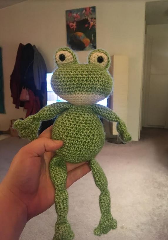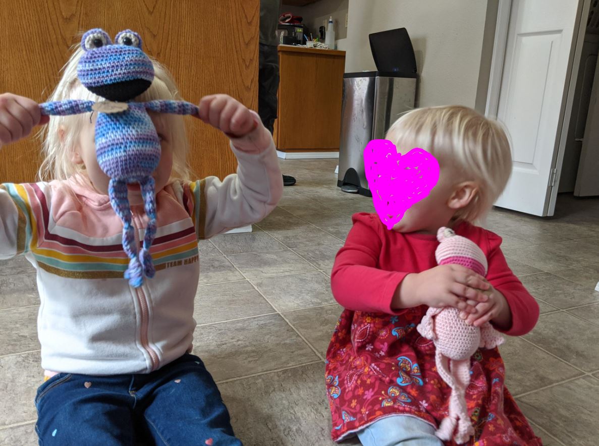 I was digging through there a couple weeks ago looking for something small I could work on and thought this would be perfect. I have made (7) of them now - 8 if you count the one I am finishing up - but I didn’t think to take photos until now. I have mailed out the frogs to friends with small children. My co-worker sent a photo of her girls opening the package: