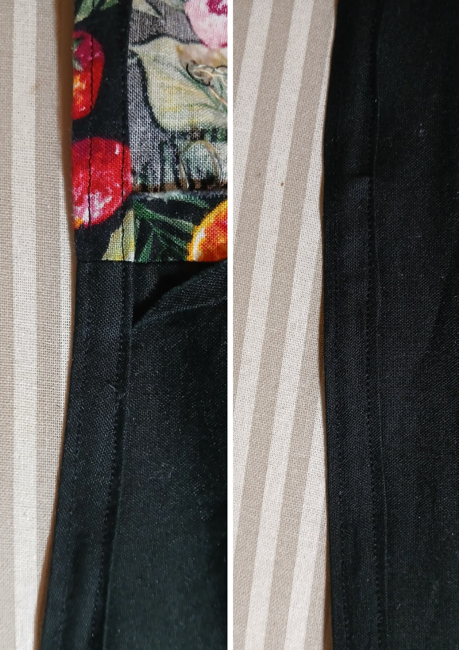 I had folded over the seam twice, so that there’d be no freyed ends. Looks like the ironing tricked me into not noticing I missed some of the double folds during sewing. Meh, I’ll just go around with one more stitch when I feel up to it.