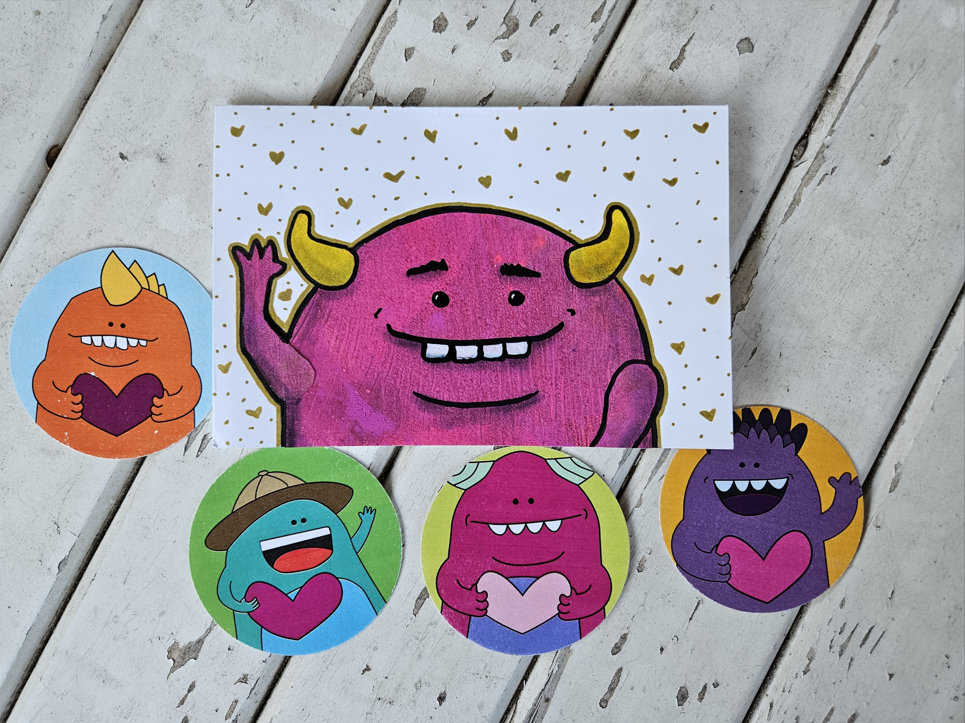 Eeeee! This cute monstercard is glittery with gold accents and the cutest darn expression. Plus, some fun stickers to share!