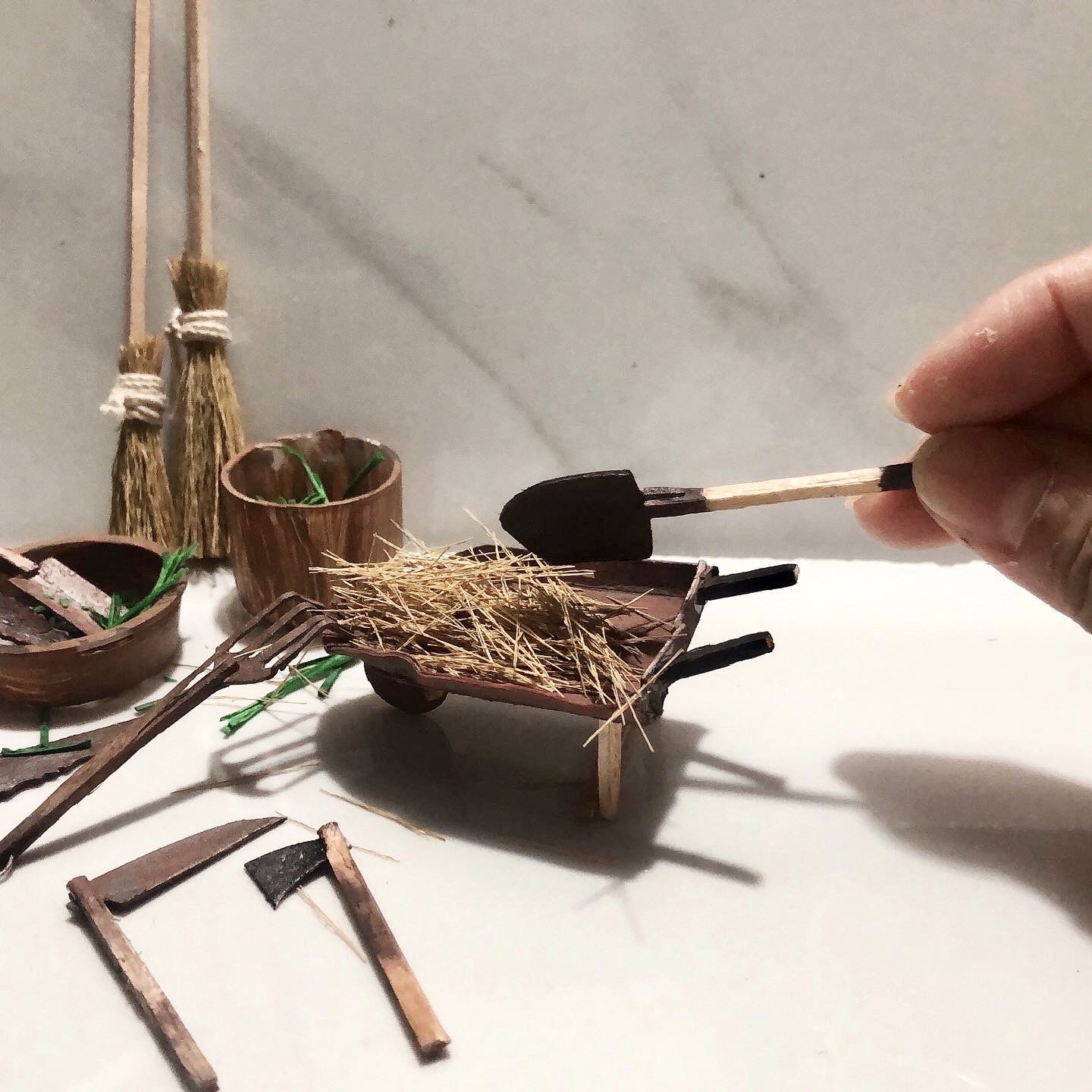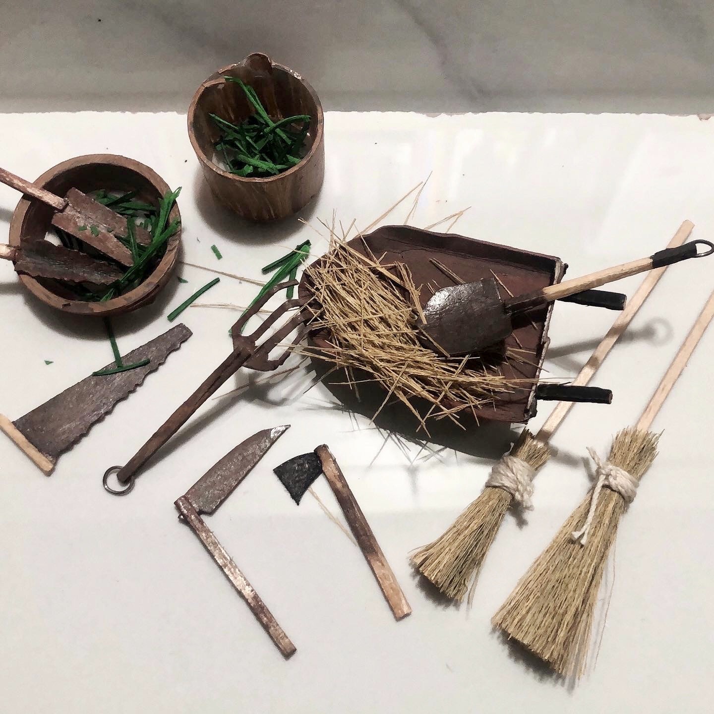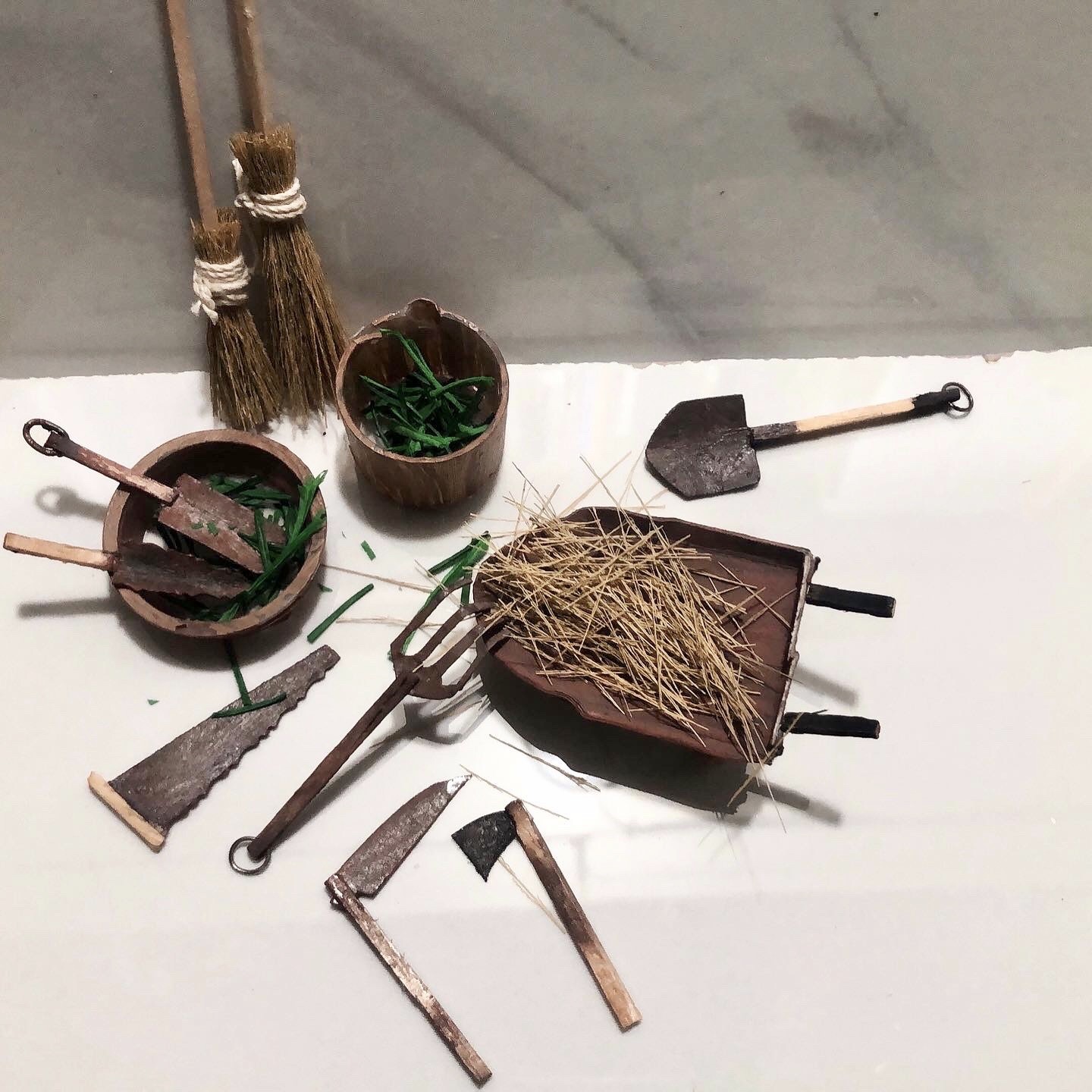 Love the little buckets full of yard debrisβ¦and the tiny scythe!