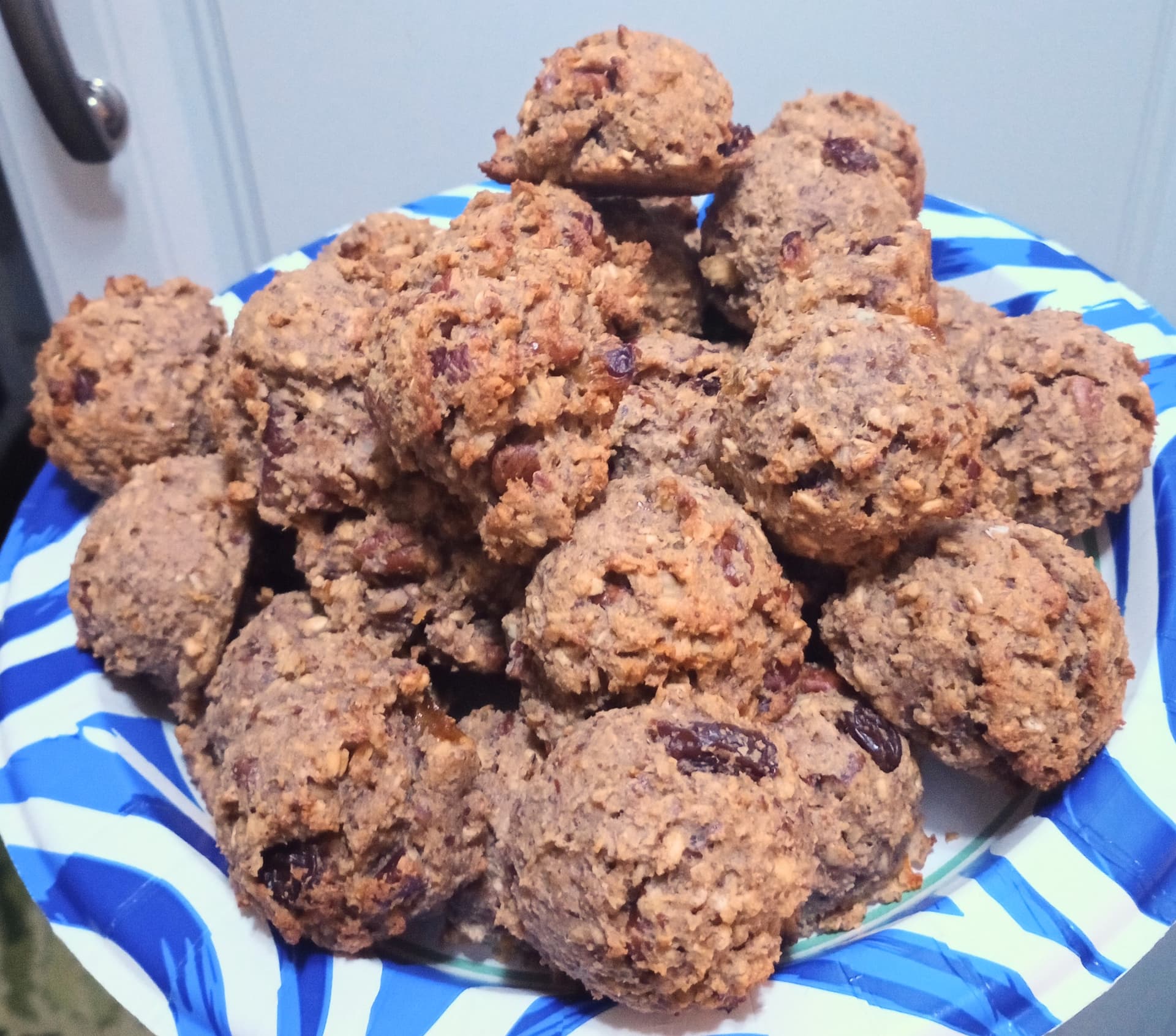 I messed with a recipe enough that it’s no longer recognizable so these are my own cookie recipe! They feel kind of like a meal and remind me of old Victorian deserts or something. Then it reminded me of a Muppets Christmas Carol. So that’s why they’re named that. They’re orange, almond, pumpkin spice, allspice, and almond extract flavor with a lightly sweet taste. Inclusions of orange-infused raisins and walnuts. Only thing is I used some steel cut oats instead of rolled. I think it would be better with rolled.