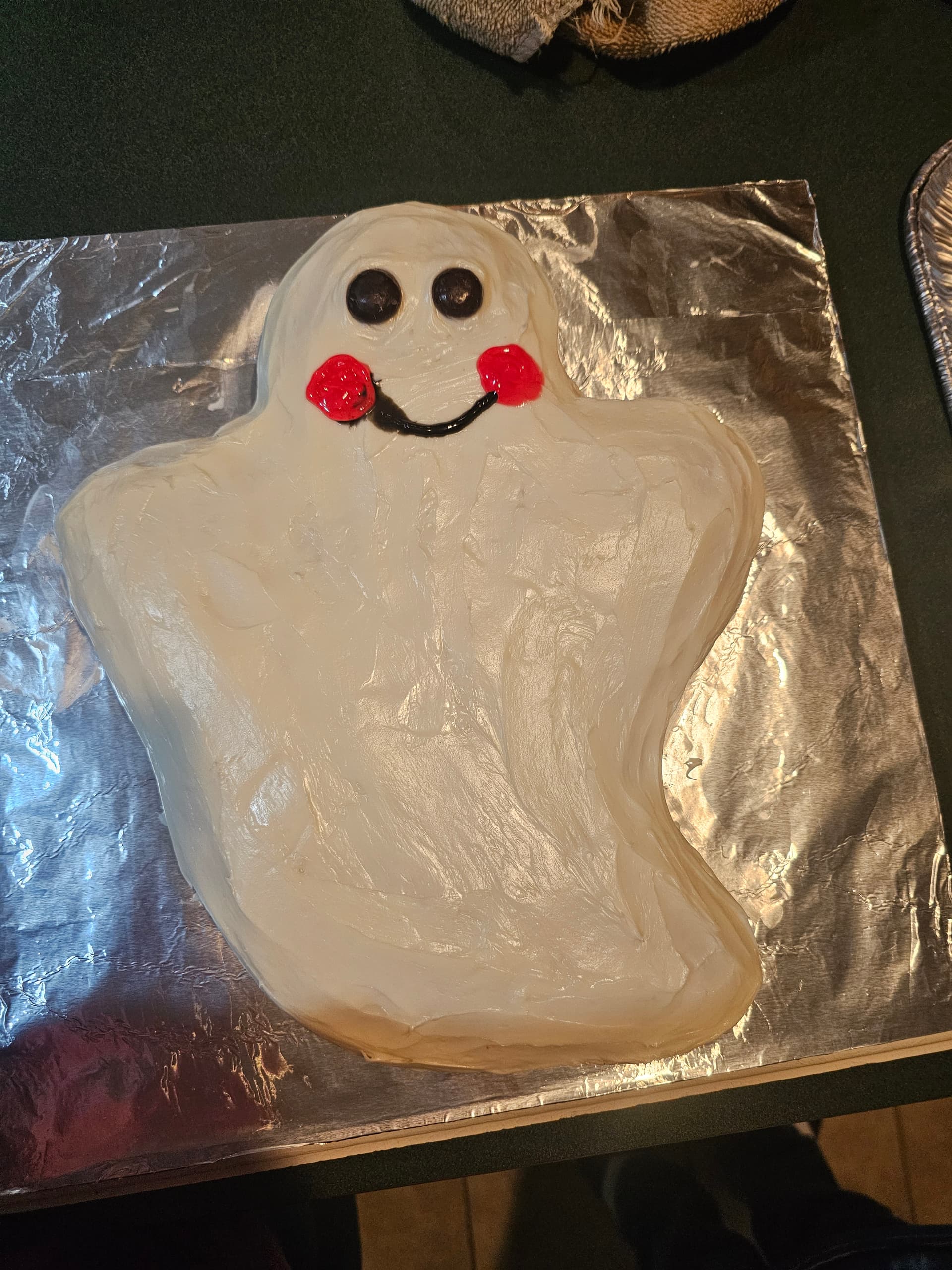 I made a ghost cake and decorated some white chocolate-covered pretzels as ghosts.