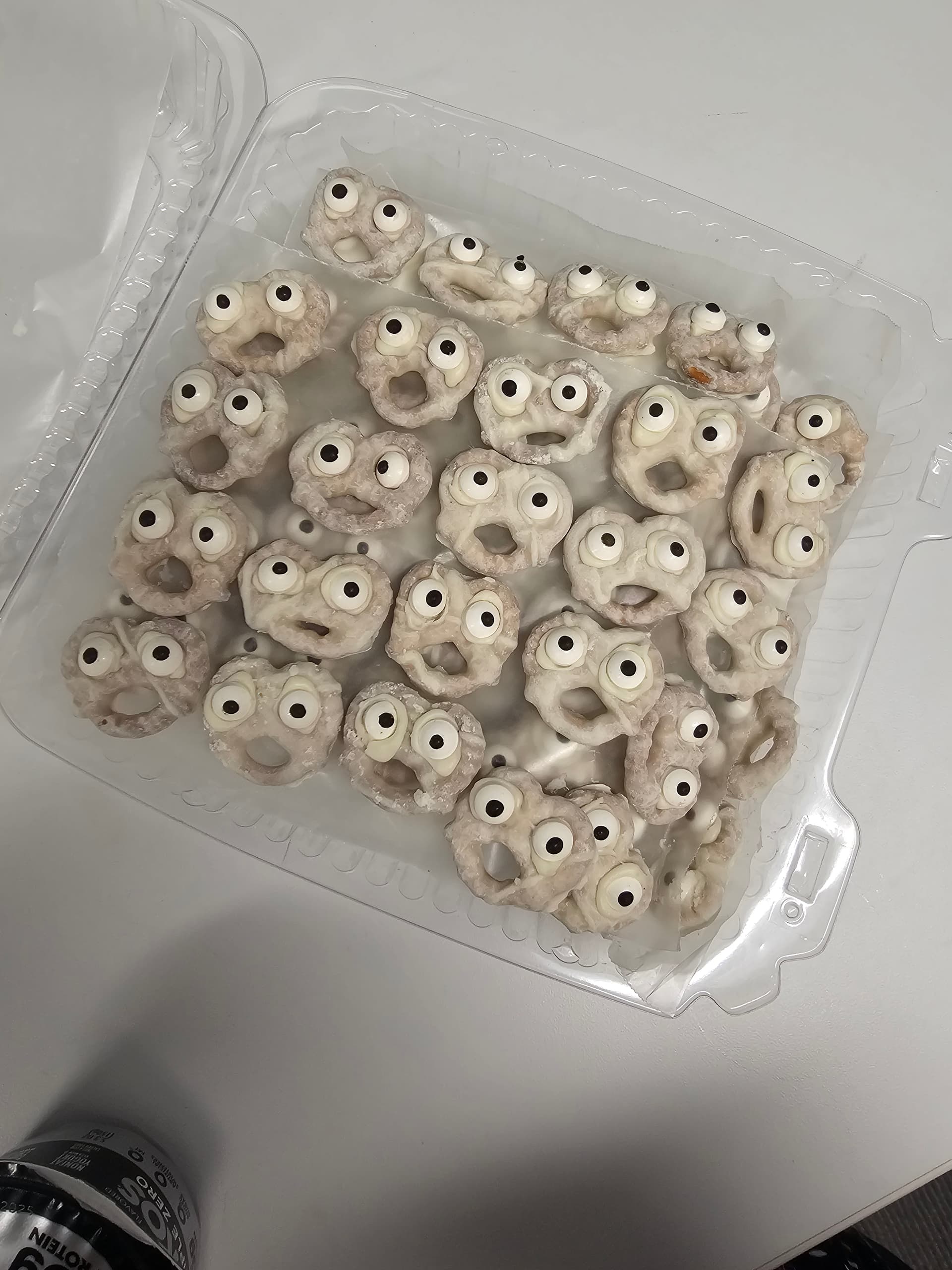 Who knew pretzels had such a variety of expressions? Lol. What a fun perk of in person work. I love things like this bc it makes the workplace fun and enjoyable!