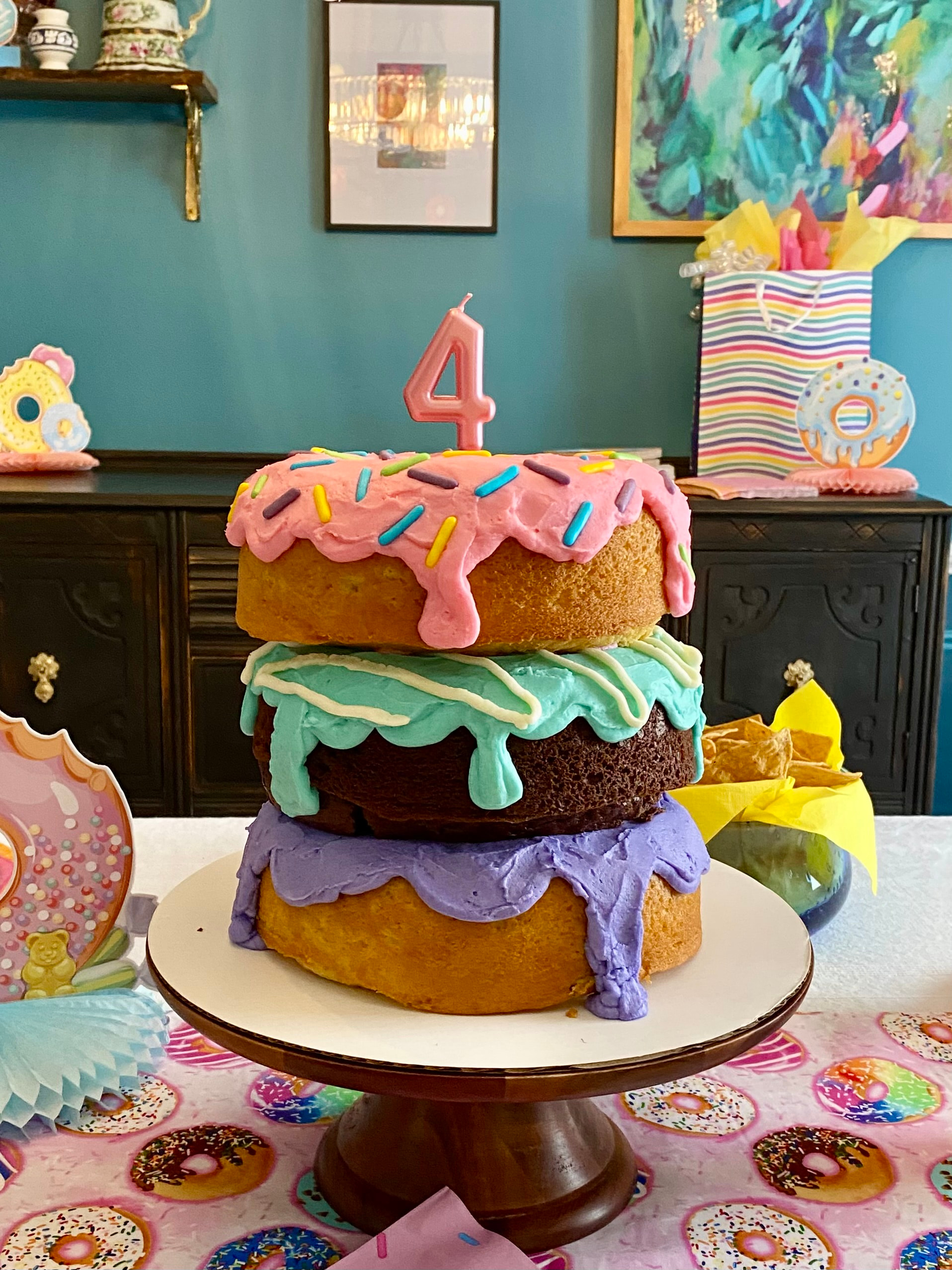 Ada’s favorite color is pink, so I made the top donut pink, and picked out the best colors of sprinkles to match. I was really worried the colors on the sprinkles might bleed overnight, but they held up beautifully. We had about 30 people at the party, and ended up with nearly 1 full cake leftover (3/4 of the purple vanilla, and 1/4 of the chocolate). Looks like we’ll have plenty of sweets for the week.