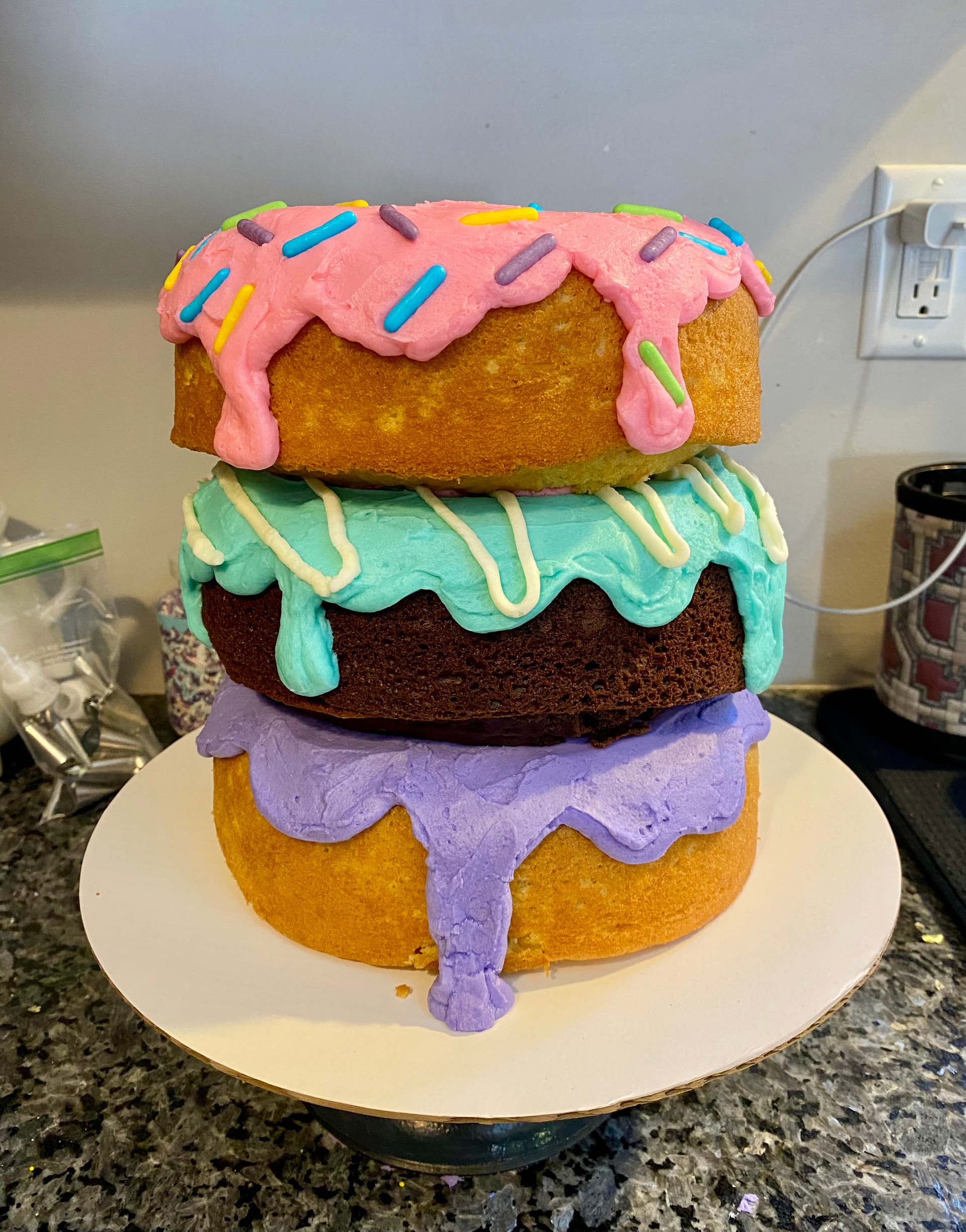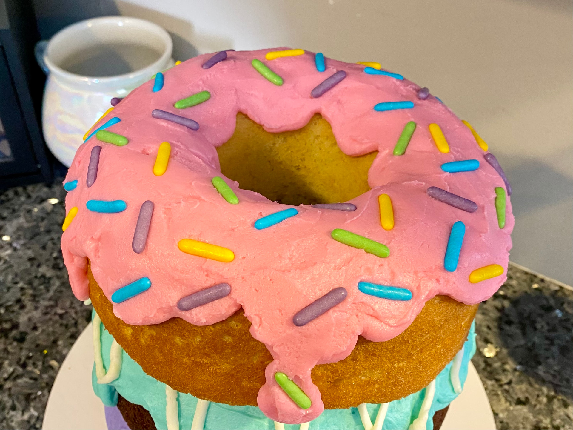 I watched a bunch of tutorials on making various donut themed cakes, but the cutest ones were stacks of donuts. (Plus that didn’t require me to carve shapes out of cake, or crumb coat everything.) I found a bottle of giant sprinkles at Michael’s, and I found the Fat Daddio ring pan lightly used for $10 with shipping on eBay. (The same one was $20 new at Michael’s.) Heck yeah!
