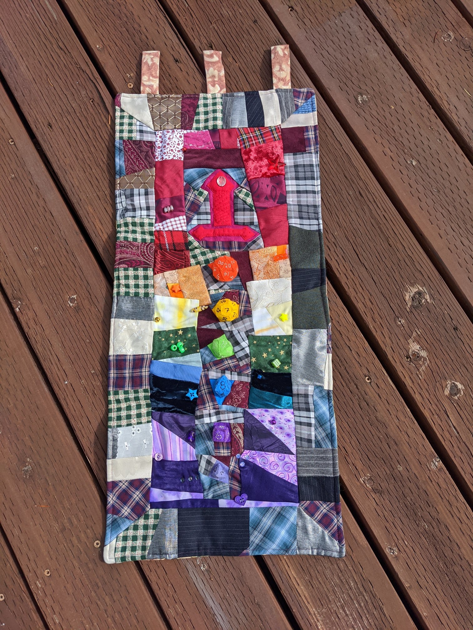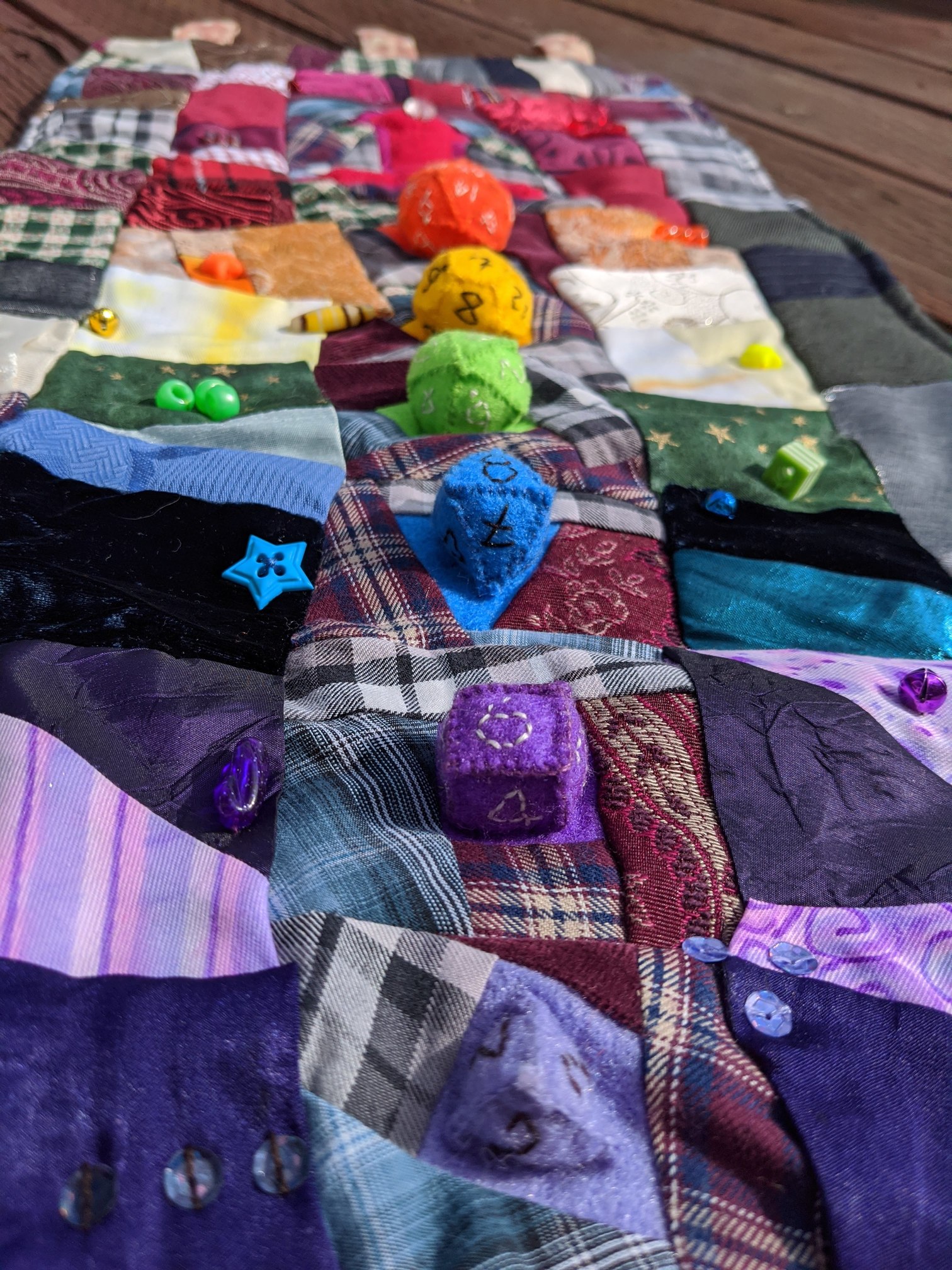 I always find complicated quilted designs so impressive, and this is even more spectacular due to the rainbow colors and the D&D theme. Those little dice are genius!