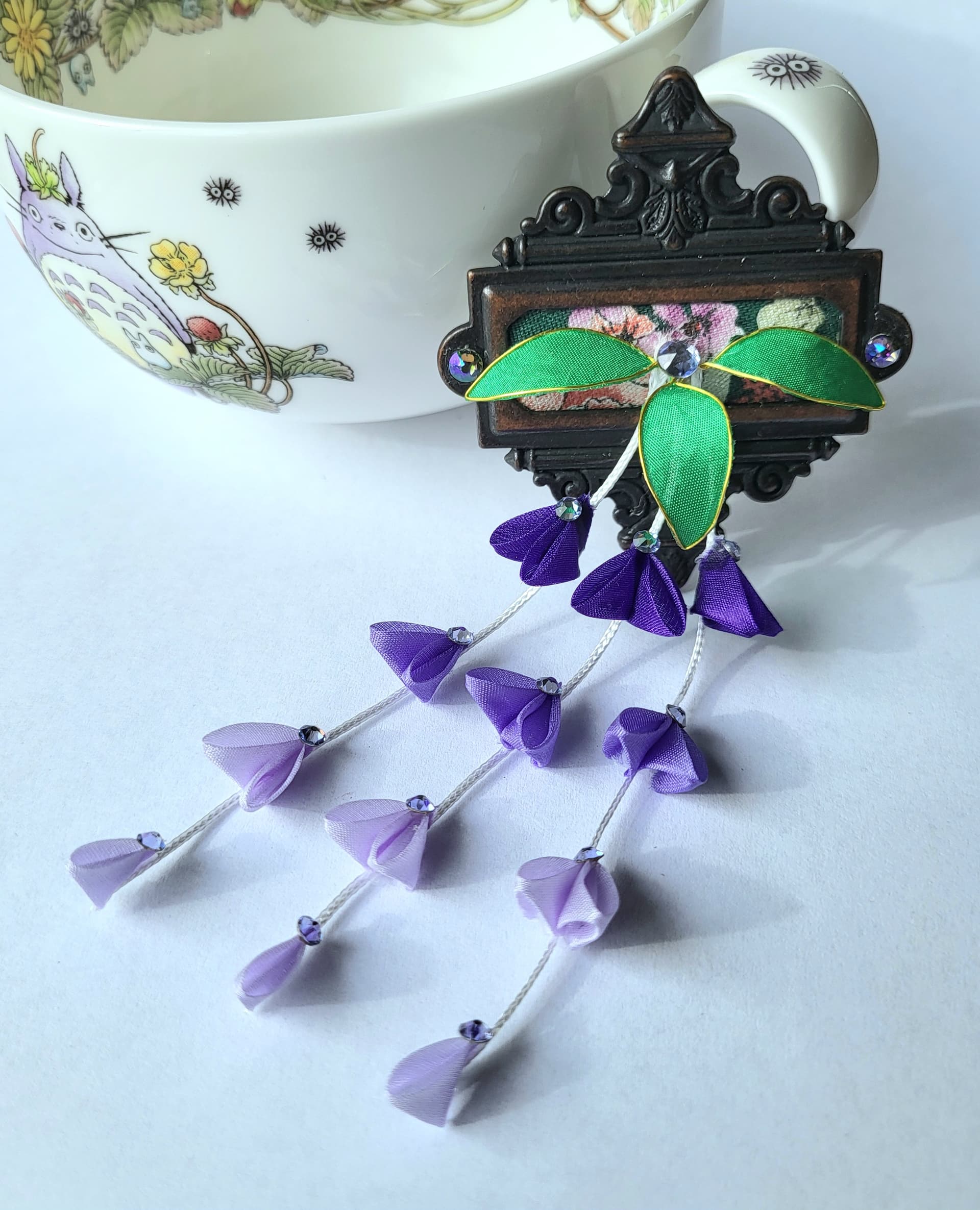 This fluttering wisteria with wirework and silk leaves on a simple u-shaped pin.