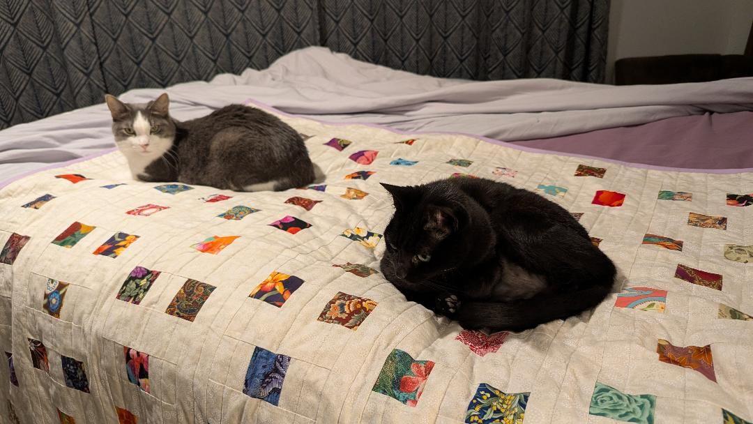 [me, speaking in a blustery cartoon lawyer voice] Ahem, yes, right. Well, while my client is, of course, flattered at the thought of inheriting such a noble collection as this, one might like to finish one’s own works and therefore be in a position to bequeath the finished pieces to appropriate recipients based on style and colors. Perhaps one might, in a case of too many quilt tops, label the tops with recipients in mind and at the will reading each can be handed to the appropriate party to be finished or not as they see fit. Surely my client’s own home TARDIS is stacked to ceilings with quilt tops awaiting finishing and distribution. Blah blah lawyer talk blah blah…”