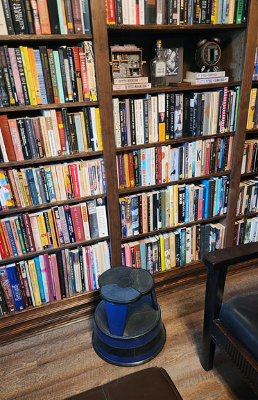 Another detail: one of the electrical outlets. The cover plates are an unfinished wood, purchased at a home center. When this project was underway, a certain TheMisterT, who is the owner of 70-75% of these books, proclained he would do a serious culling. As the completion of the shelves approached he started waffling. Ahem. We had both thought there would be room of objets and seasonal decorations, including lights and other plug-in items. I had planned to cut notches in the back of some shelves to accommodate cords behind the books. Obvs this is not an issue!