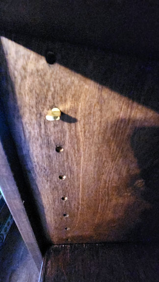 I had enough clamps to attach the moulding to 5 shelves at a time. For staining and waxing, I worked in batches of 7 and originally made 7 for each of the 5 cavities. I ended up making one more once all the books were loaded, because we had room in the center section. As each batch was done I would bring them into the house and put them in temporary places in the cases. I used brass pegs.