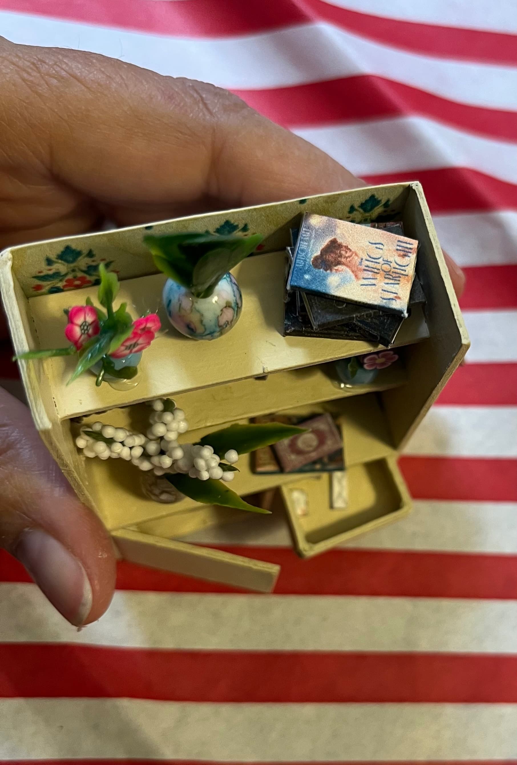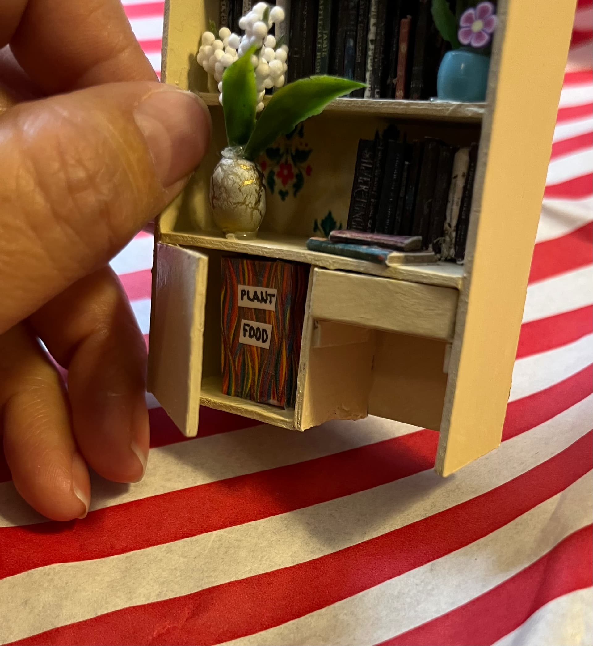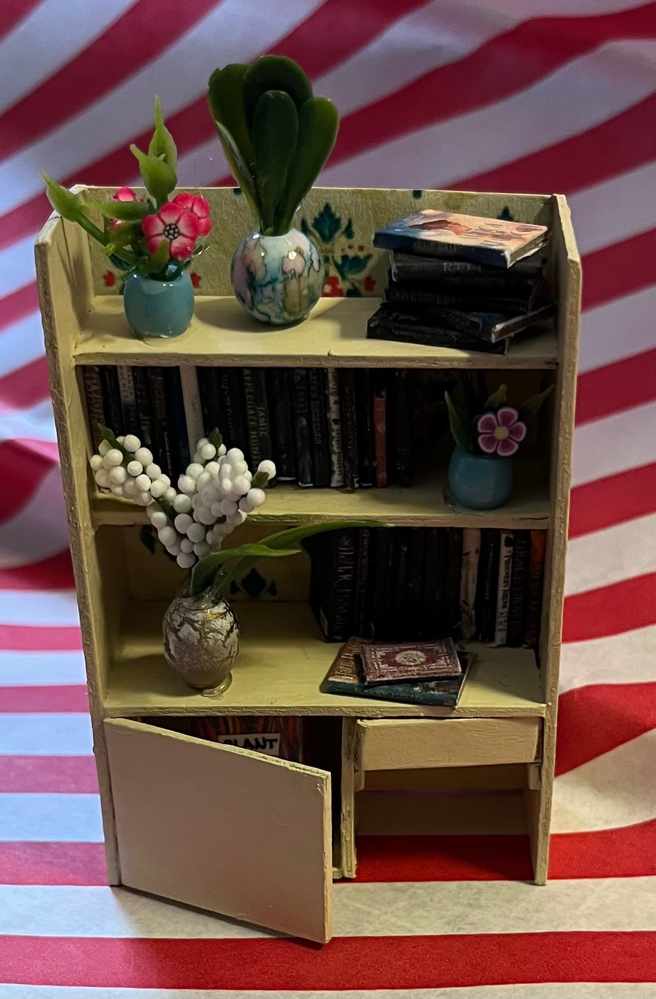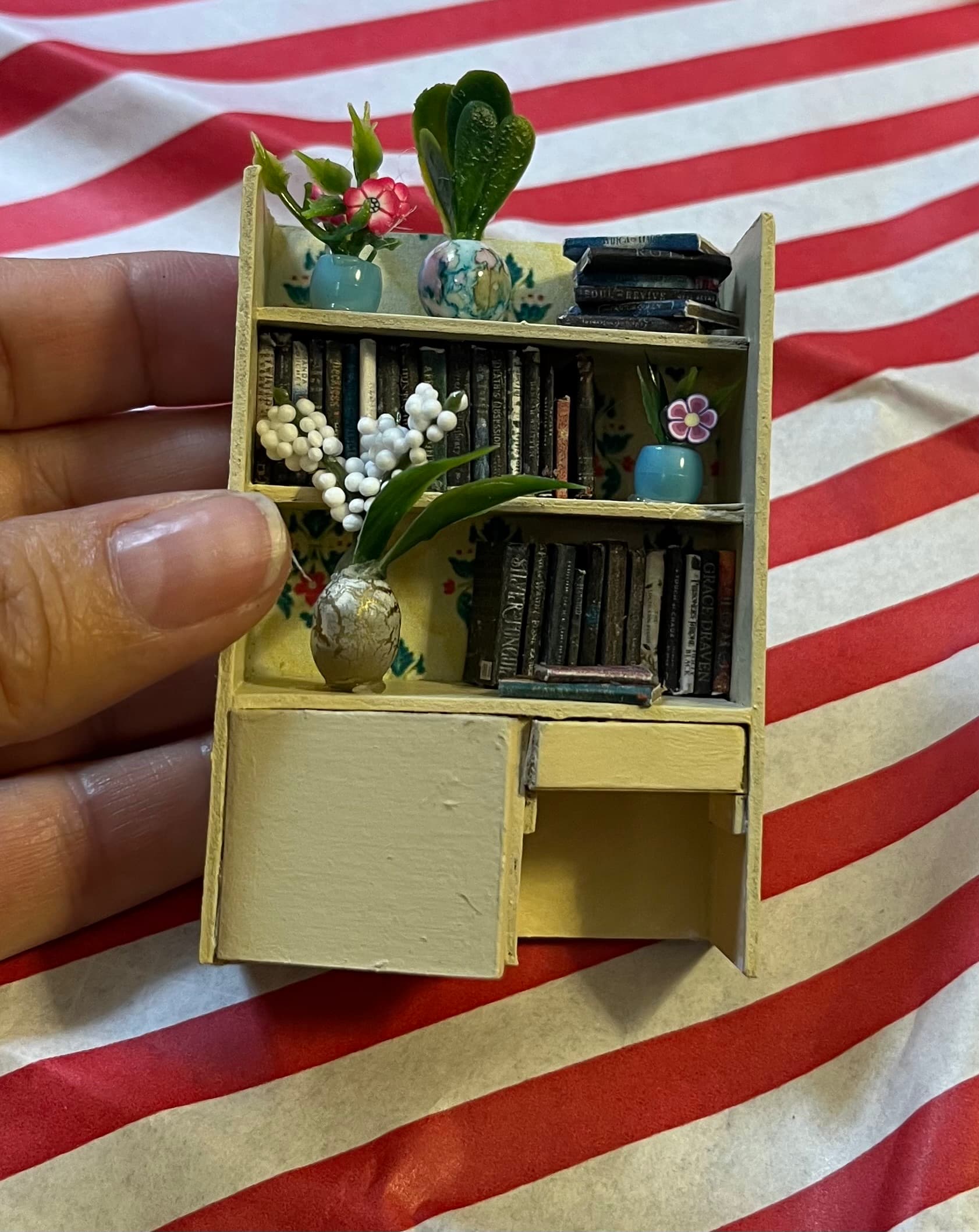 Beads became plant pots and tiny leaves clipped from other fake plants became the greenery. I added some polymer clay floral nail charms for blooms. I already had some books I’d made for previous projects, which worked great here.
