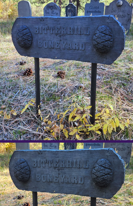 This is an older project, I made most of the headstones about a decade ago, with the Clara and Girl in Green ones each made a few years later. They’re rigid foam insulation, mostly “carved” with a heated stencil cutter, but also with a craft knife. Various other styrofoam bits as well as decorations made with metal, plastic, airdry clay, craft foam, and wood were added with construction adhesive. Then the whole thing was painted with layers of greys and watered-down black acrylic paint. They have 2 lengths of PVC pipe on the back through which are short lengths of rebar that have been pounded into the ground. They’ve become a bit dinged up and damaged over the years, especially being stored in our non-climate-controlled shop loft. Meh.