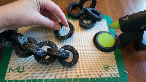 The original fence was inspired by something I saw on the internet where you slice “links” from pipe insulation. I had trusted the adhesive strip that was part of the original to close the links and they did not hold. So the broken chains sat in storage for years. I carefully glued each and every one of them with hot glue this year. I also had to by another insulator to make another length of chain, so it’s a little different. I think it makes the “scene” just look that much more old and repaired over time.
