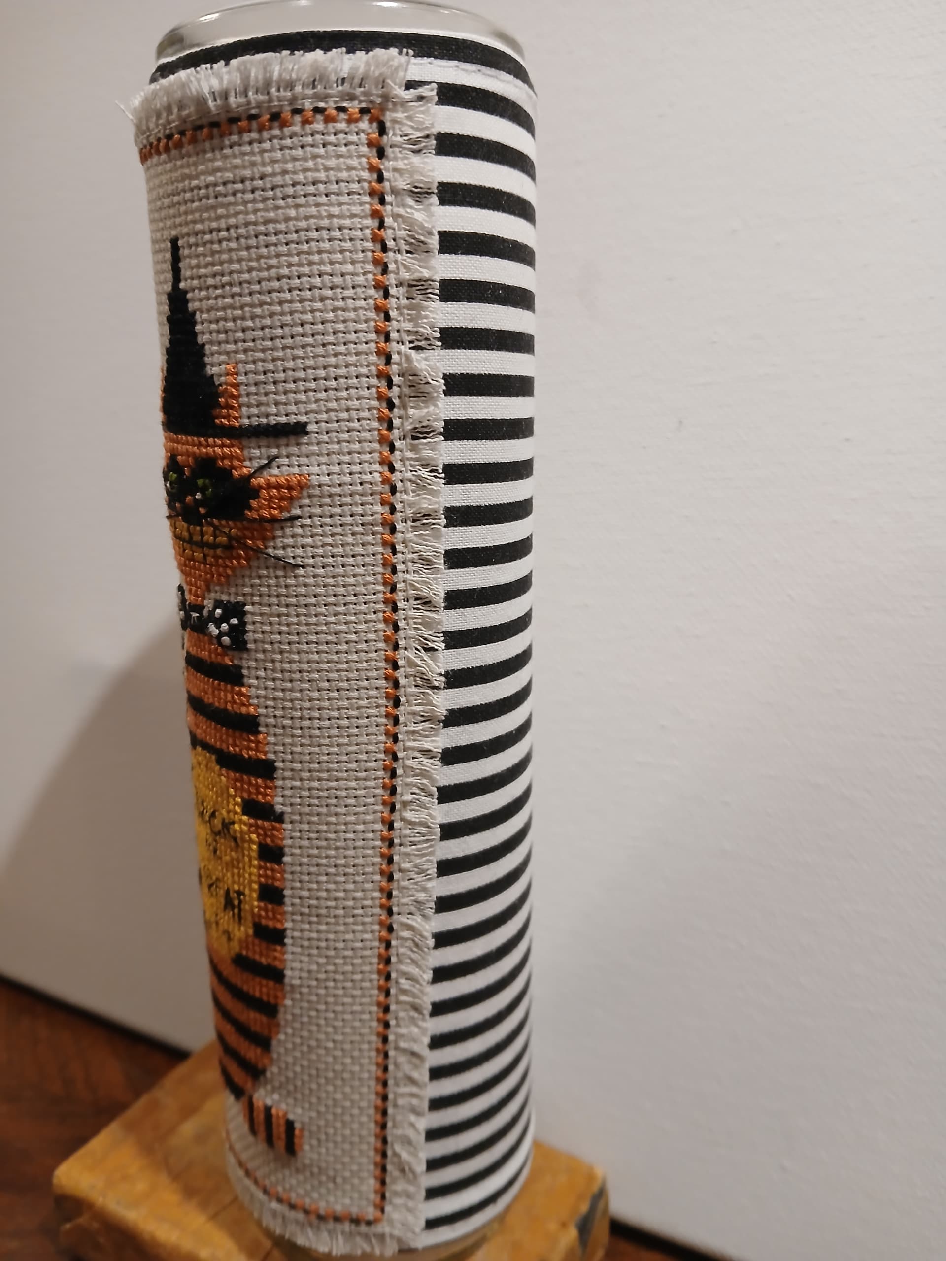 Turned my stitch into a candle wrap. Bought a prayer candle at Dollar Tree. I probably won’t light it…cats, but a fake tea light will fit!
