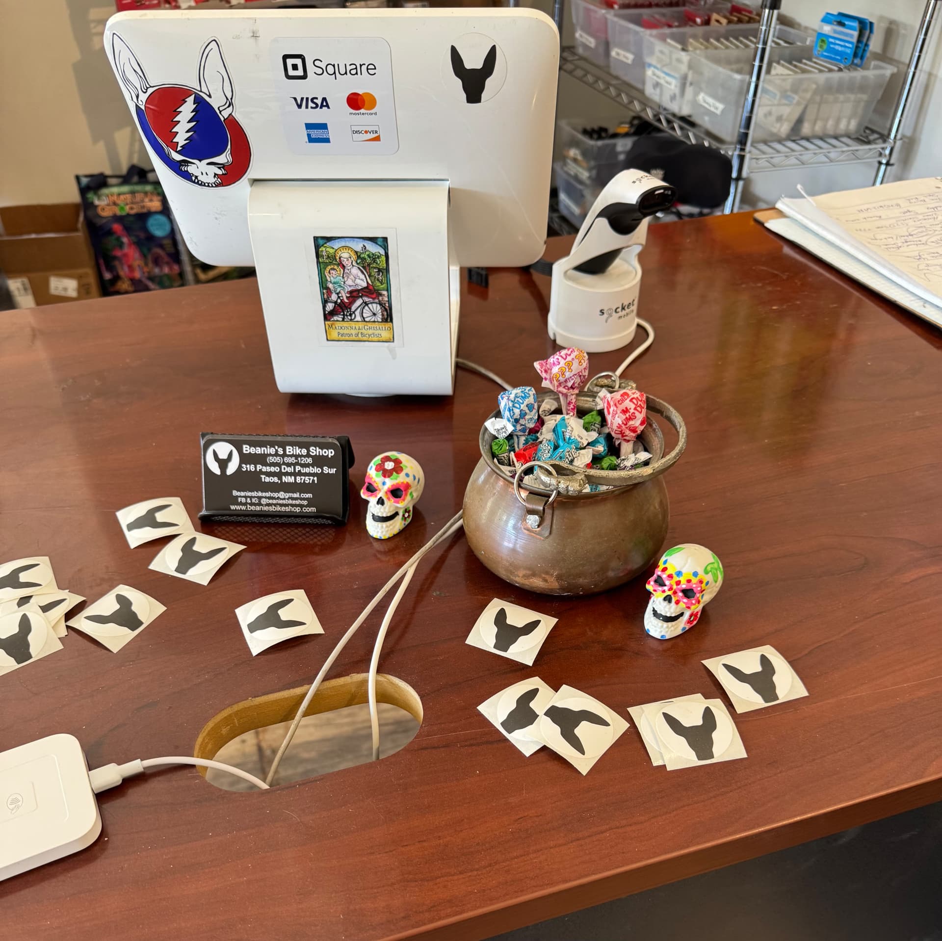 My cauldron of candy and a couple of my plastic calaveras. They’re all over the shop…
