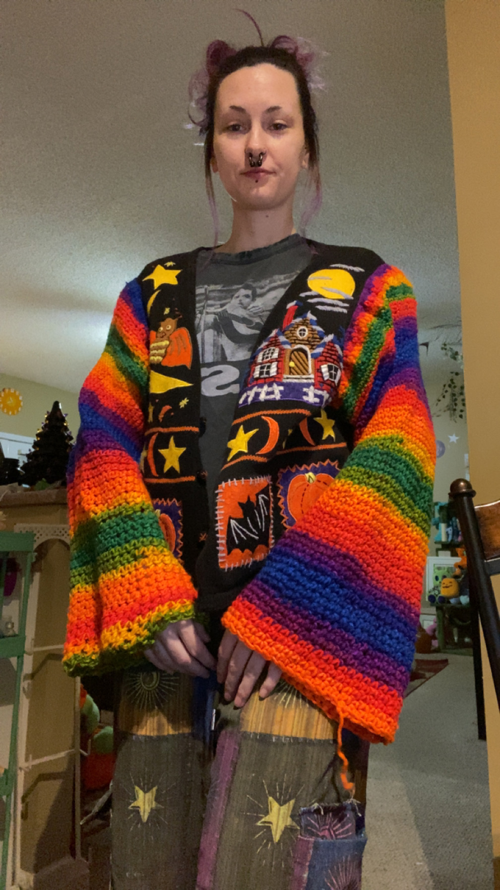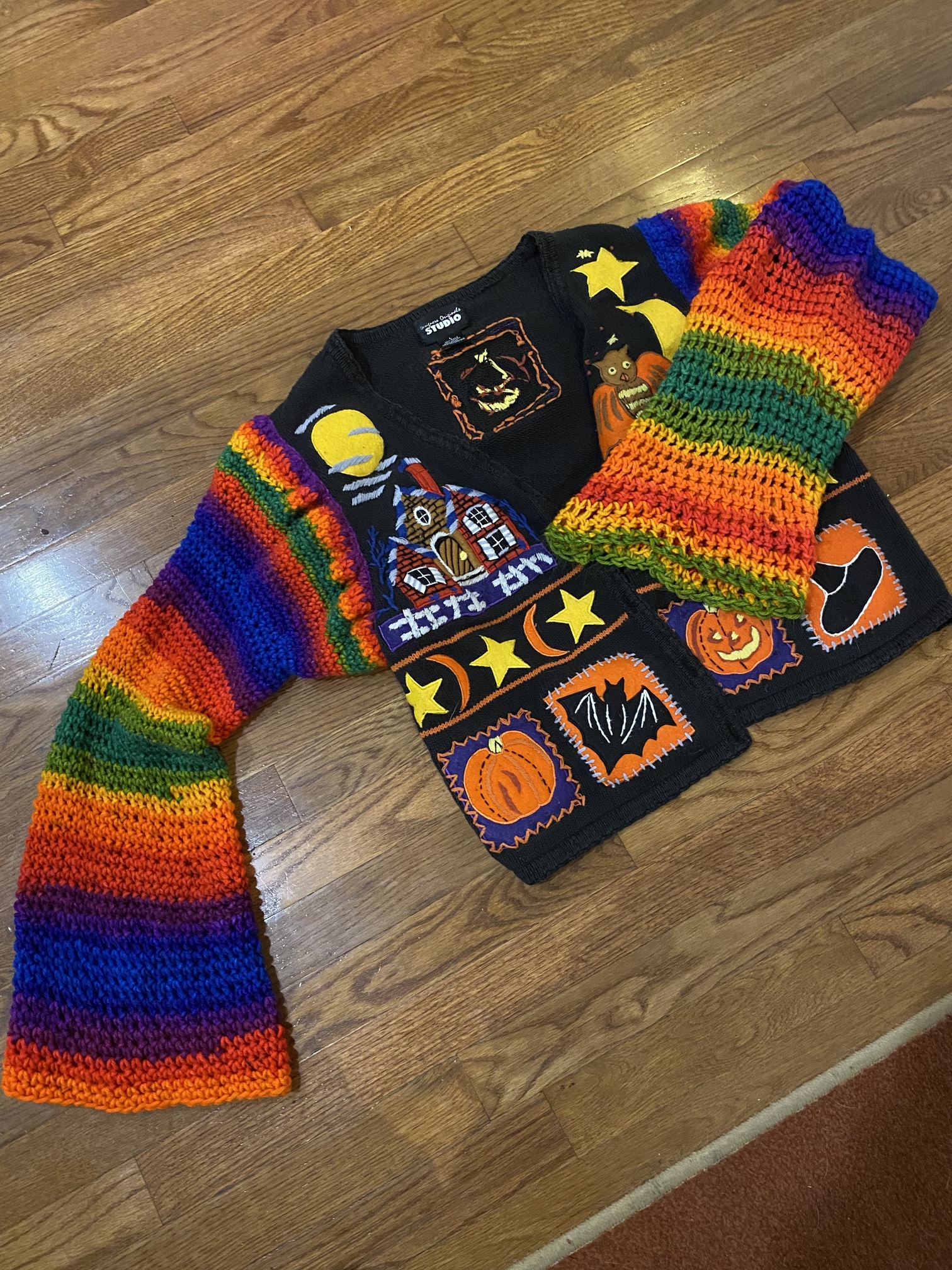 This is such a brilliant idea!! I am saving this. I have a hoodie from high school I can’t bear to part with but the sleeves are trying to jump ship from the body despite multiple times of resewing the torn edges. I may just cut them off and try to do something like this. The Halloween vest of it all takes it to a whole other level too. Priceless!