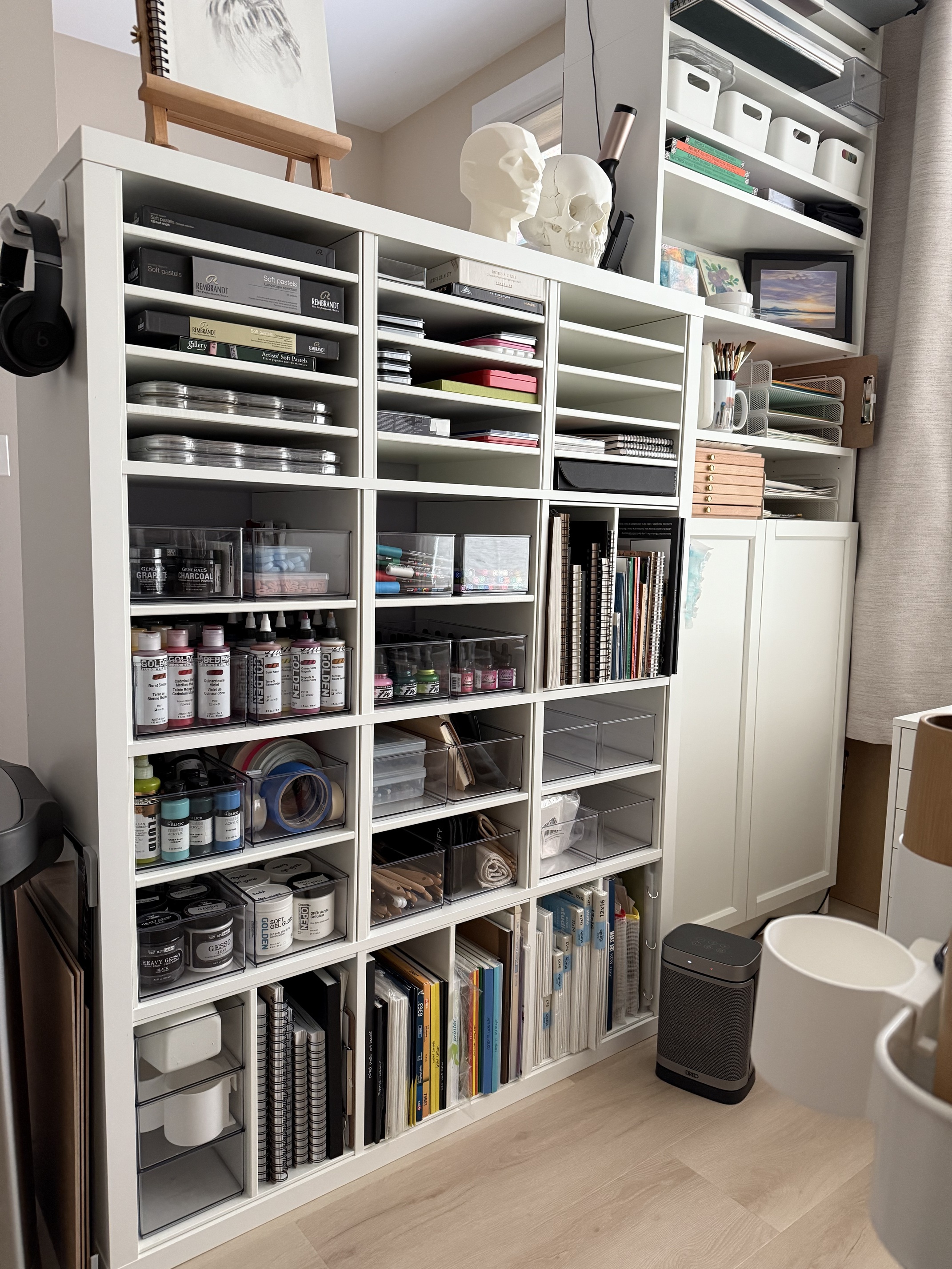 Does organizing count in this thread? I’ve been slowly shifting some things around on my kallax to make them more functional. View from my desk this morning. I love having my 3d printed skull and head there, it’s really feeling like an art studio.