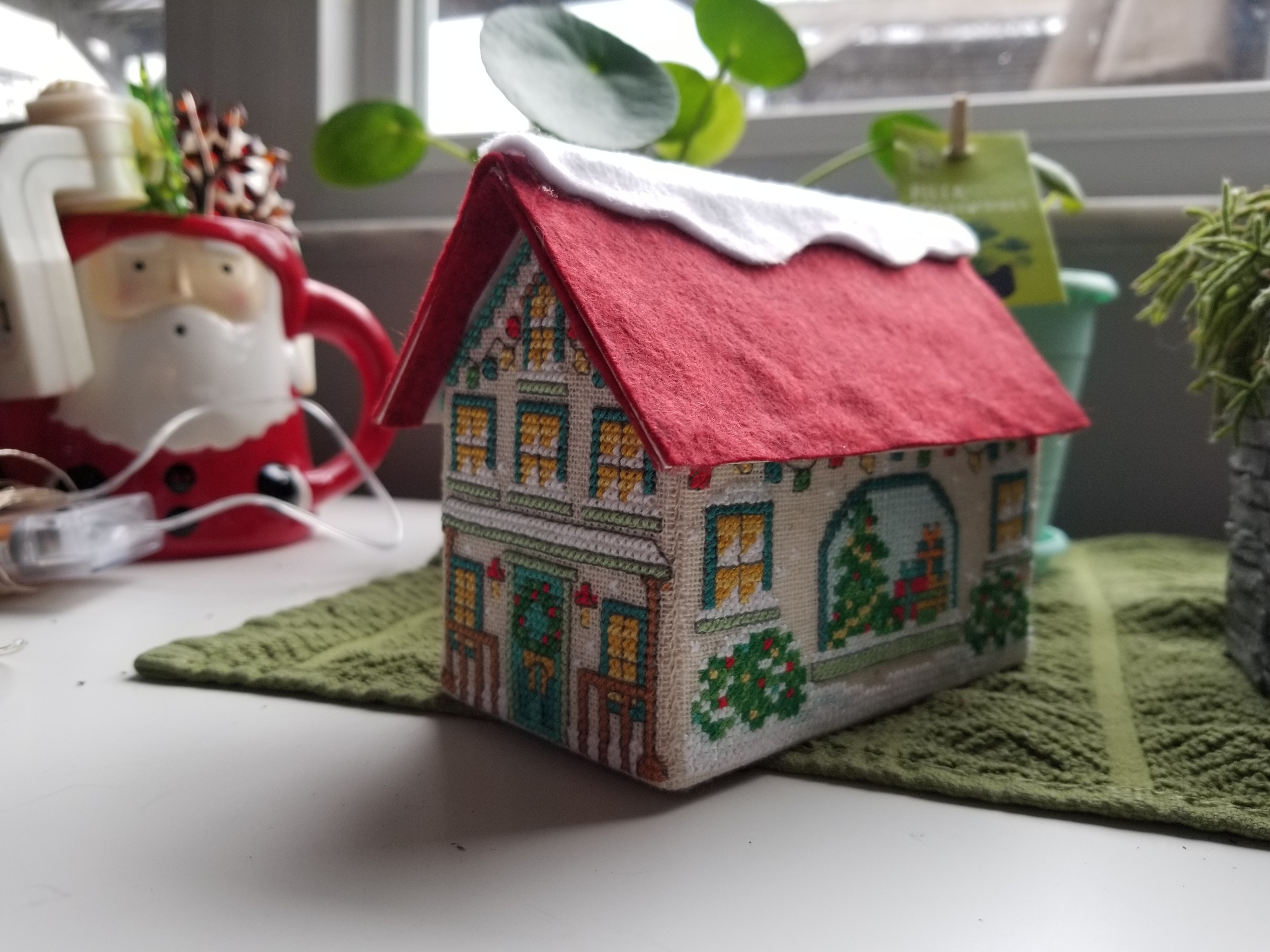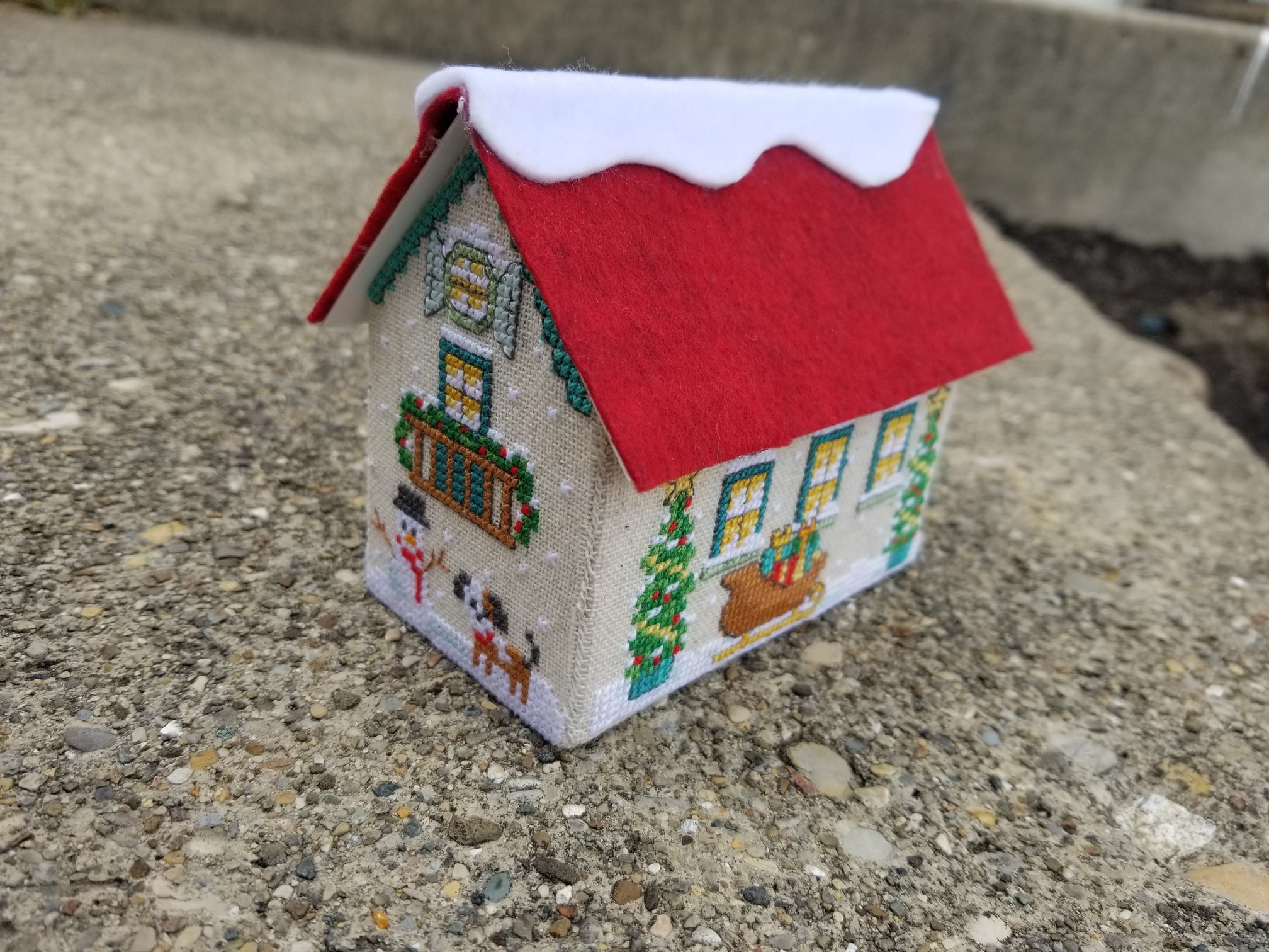 The roof (which will probably be redone in the future is cardboard covered in felt. I added some white felt to make it look like snow. It had looked like it was missing something. I didn’t actually attach the roof (because I’ll probably redo it someday) but also, if you take the roof off, you can lay the house flat which is good for storage purposes!