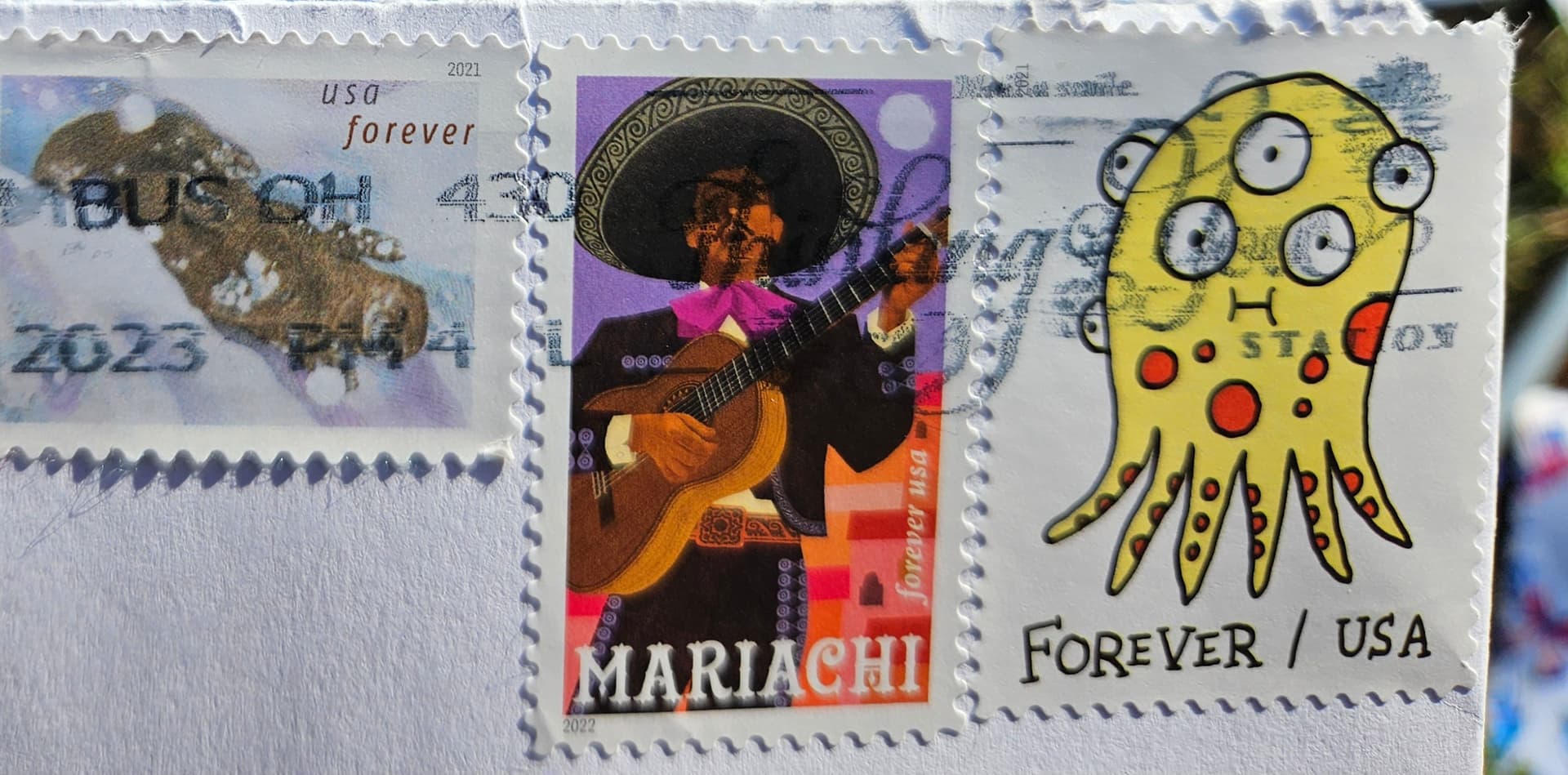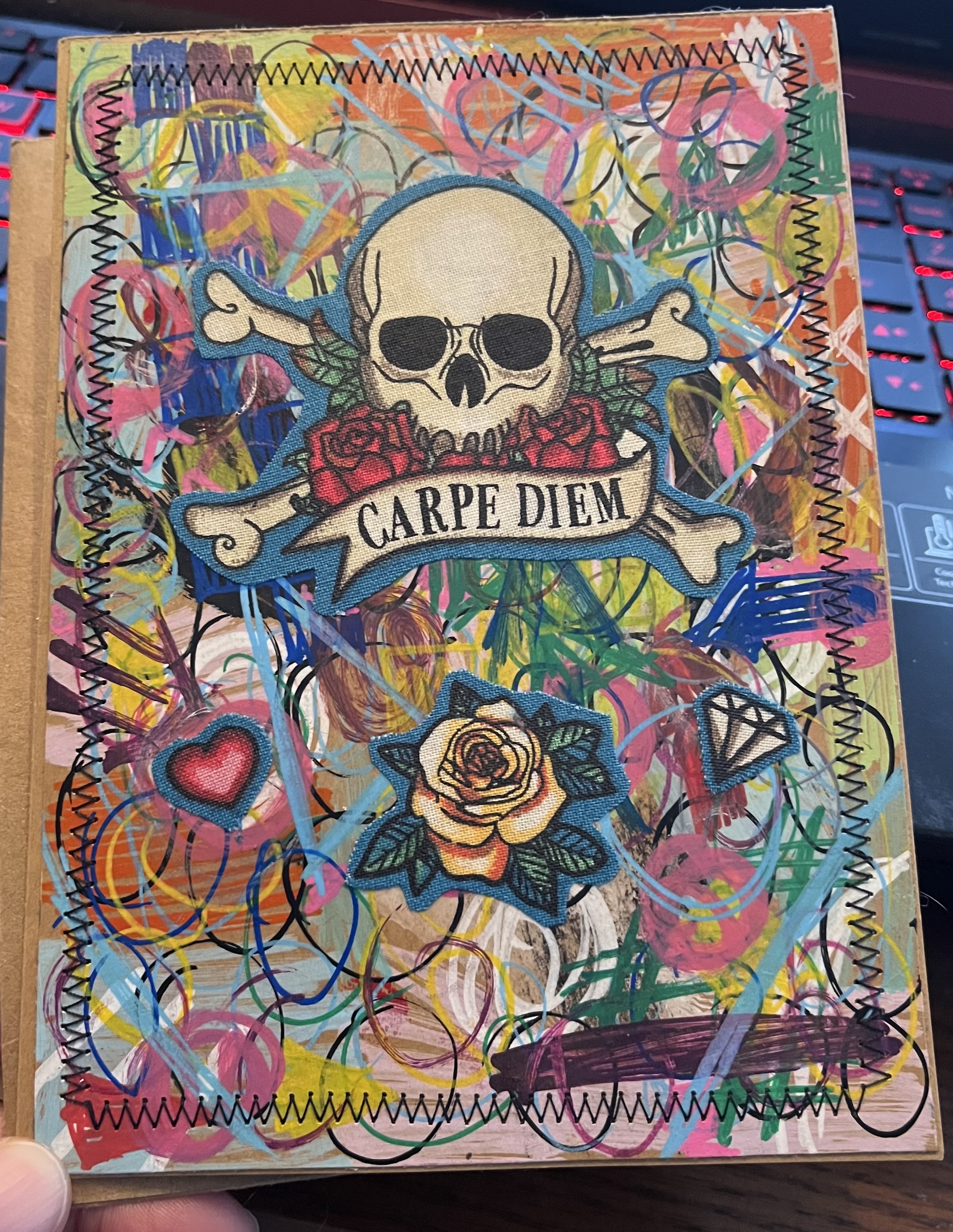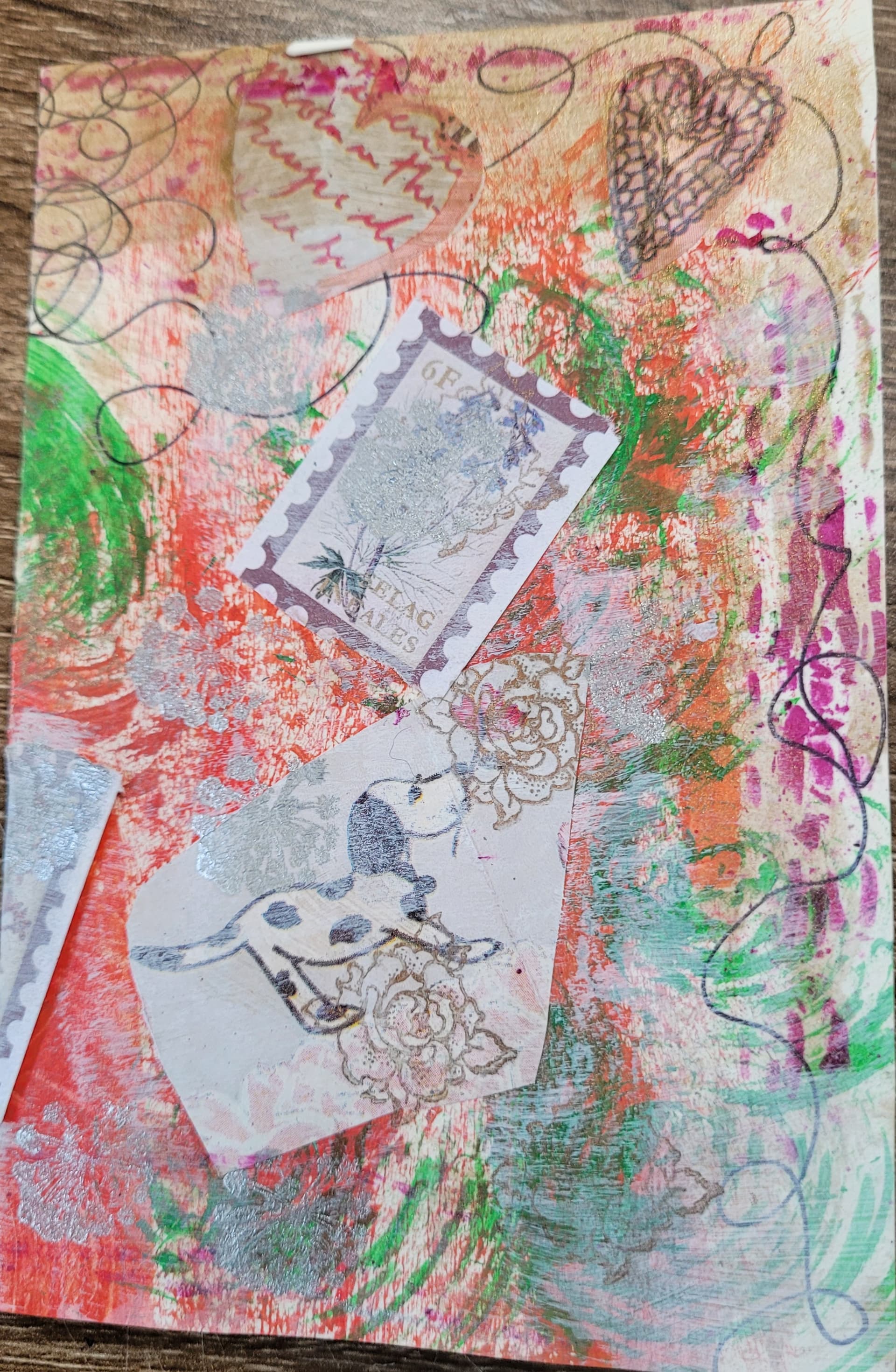 I also received a beautiful mixed media card from @LindyBlues!! I really like the colors and all the cool stamps on it!
