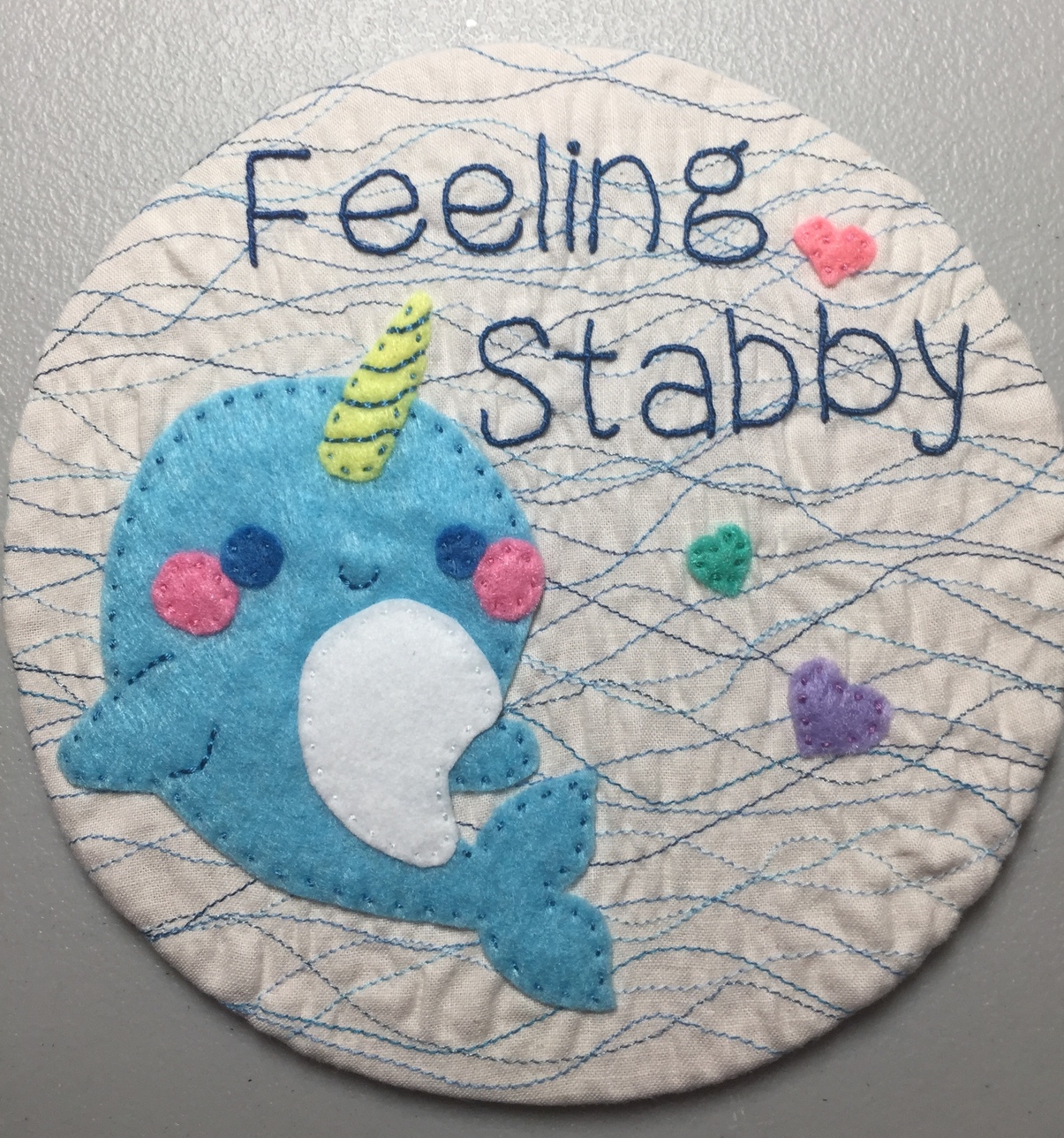 Also, the lettering on the Stabby Narwhal hoop is done in whipped backstitch! It’s my favorite stitch for nice, solid, well-flowing letters. Basically, you outline the words in a plain backstitch–I used two strands of floss for that, I think–and then you go back over each one with another 2-3 strands and do a spiral stitch through all the front-facing back stitches without piercing the background fabric at all. @JoyfulClover