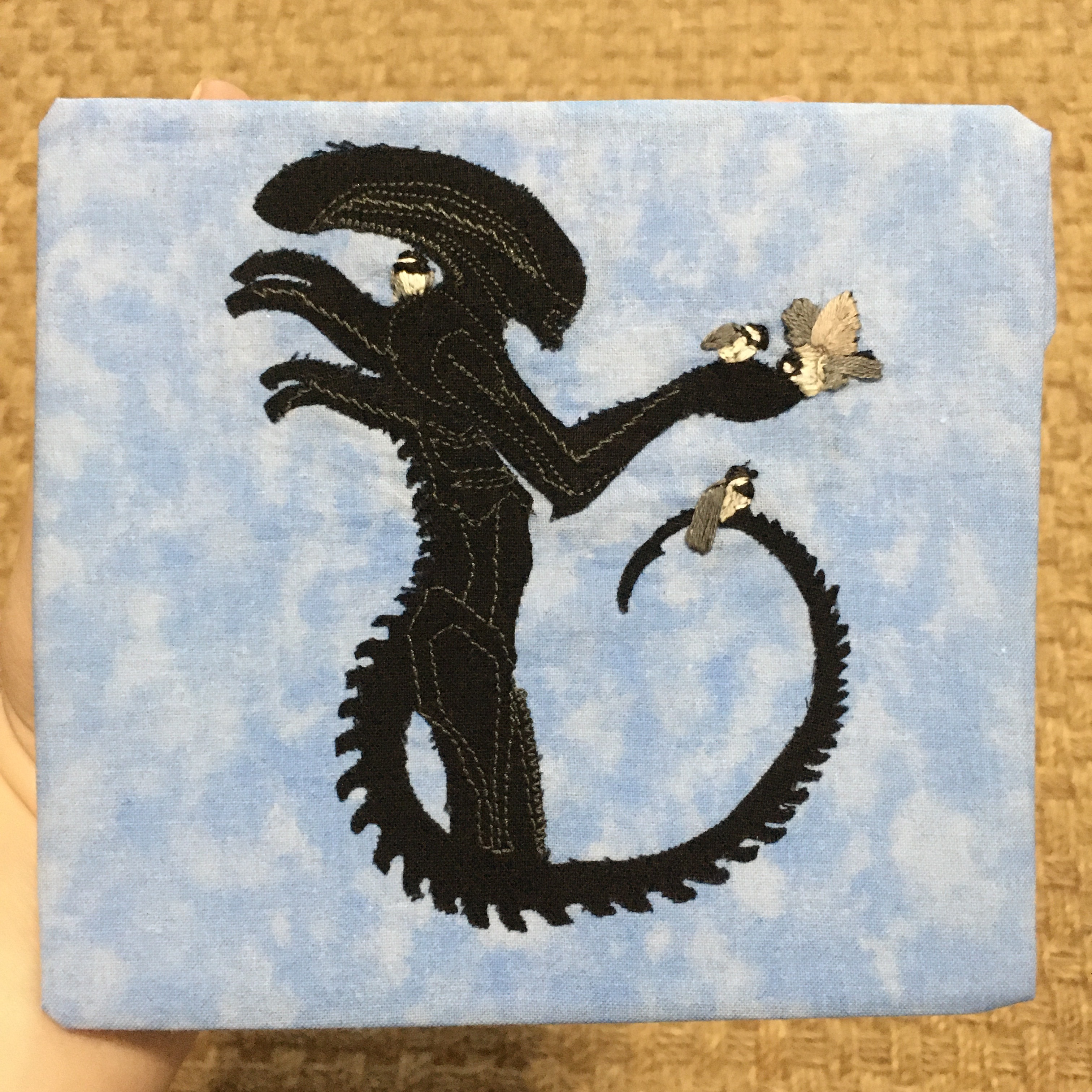 Thank you! I had originally intended to cut the xenomorph out on the Silhouette, but it needs a driver update, so it derailed me. Instead, I ironed some Wonder Under to the back, ran it through my printer to get the design on it, and then carefully cut it out. I had a bit of a panic when parts of it lifted while I was doing the bird embroidery, but I was able to hit it with the iron afterwards to stick everything back down. Otherwise, I was going to have to use some fabric glue!